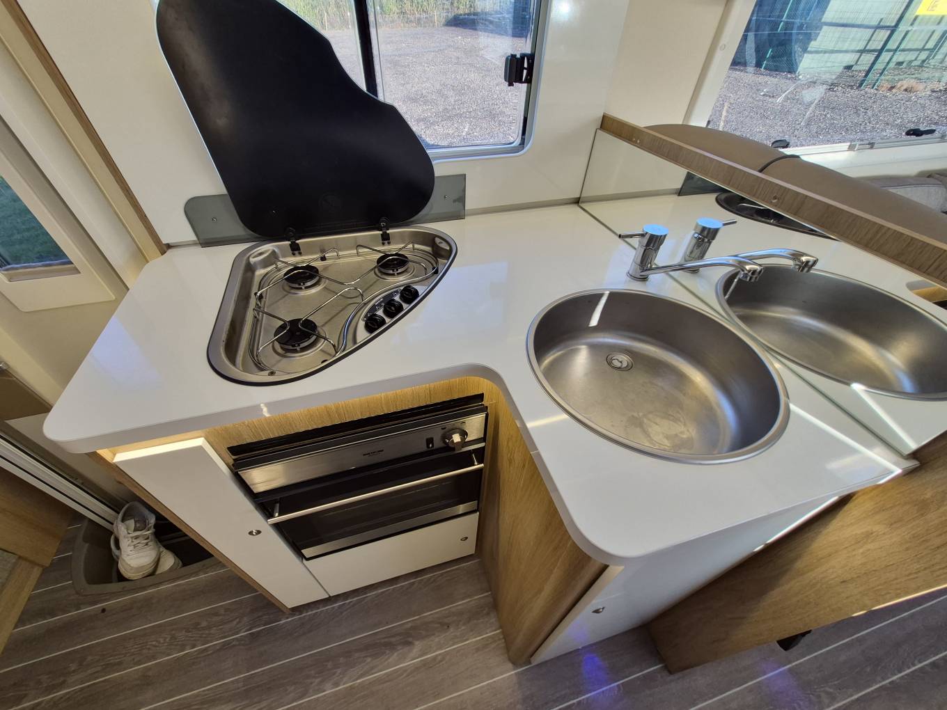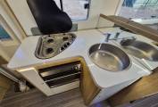The mid kitchen comes fully equipped with three gas hobs, Large Dometic 3-way fridge with Separate freezer compartment, oven & grill, sink.