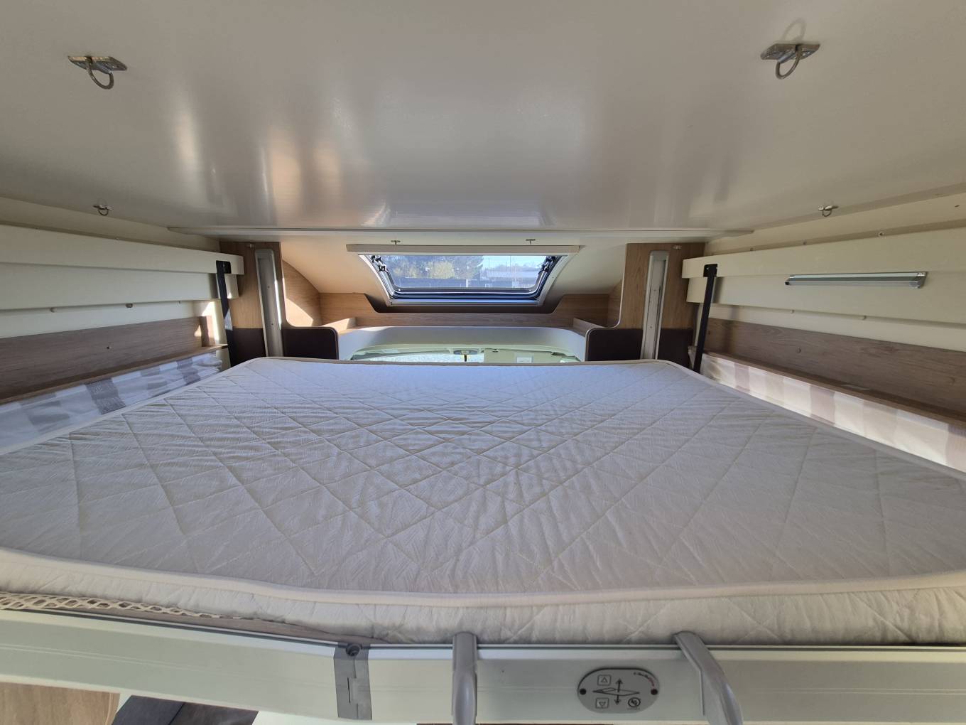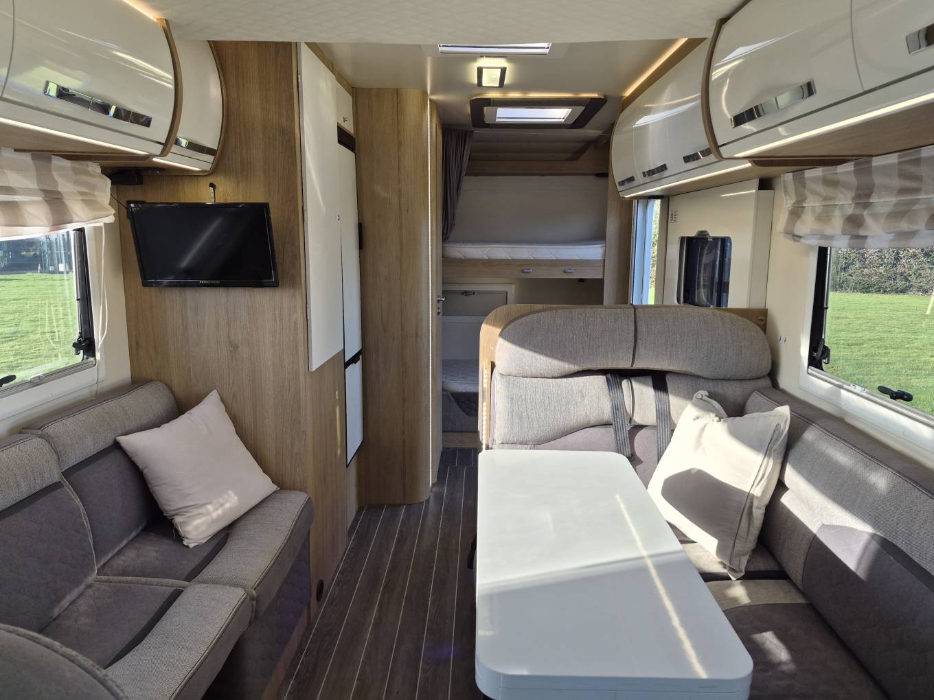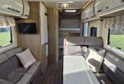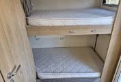 A choice of sleeping areas are available, with the sizeable electric drop down bed over the Lounge area and second Double as well as a single can also be made up in the lounge area also at the front, and twin Bunk beds to the rear.