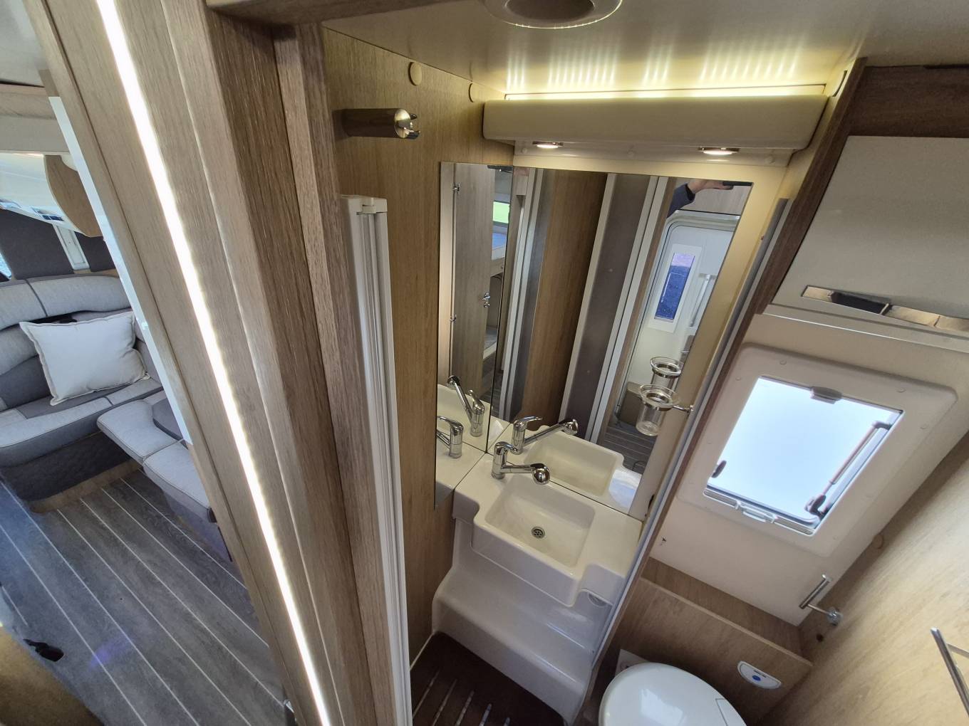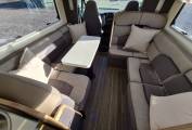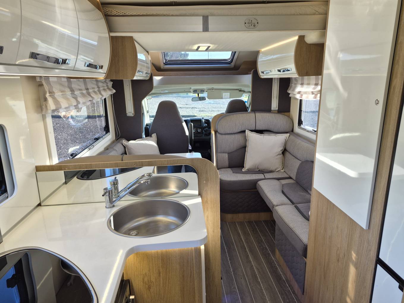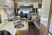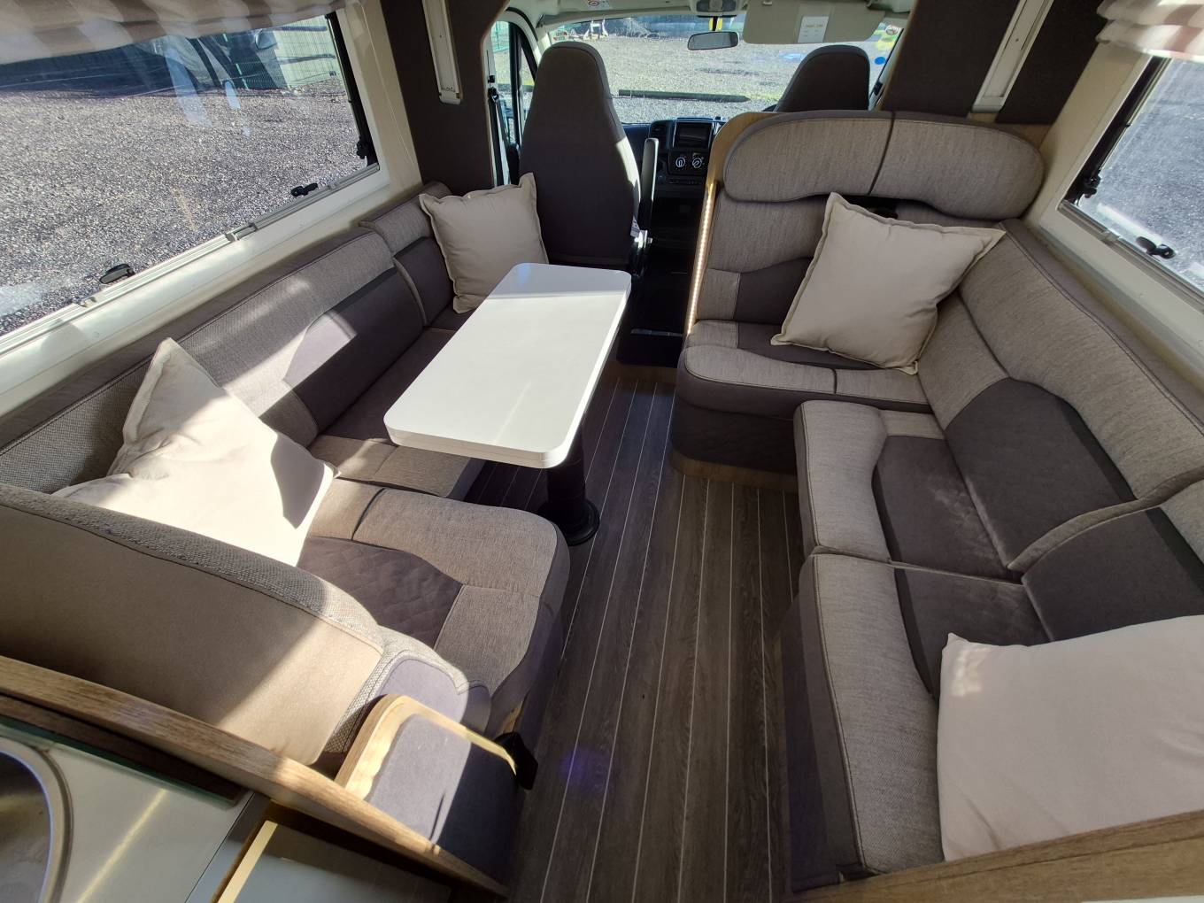 The spacious forward lounge area comprised of two opposing L shaped Sofas that can comfortably seat six and the driver and passenger seats swivel round to allow even more seating , perfect for socialising and meal times. There is a Smart TV on a adjustable TV Bracket fitted and fully adjustable table that folds in half for easier access to the cab area.
