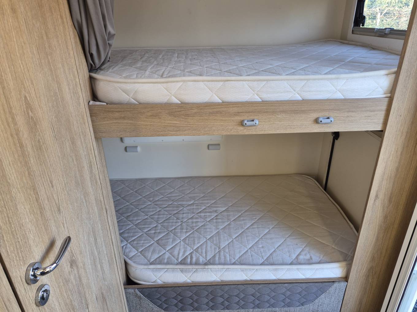 Storage is abundant, with plenty of wardrobe space at rear, overhead storage lockers, and with the option of a large garage with tall opening doors either side with the bunk beds folded away.