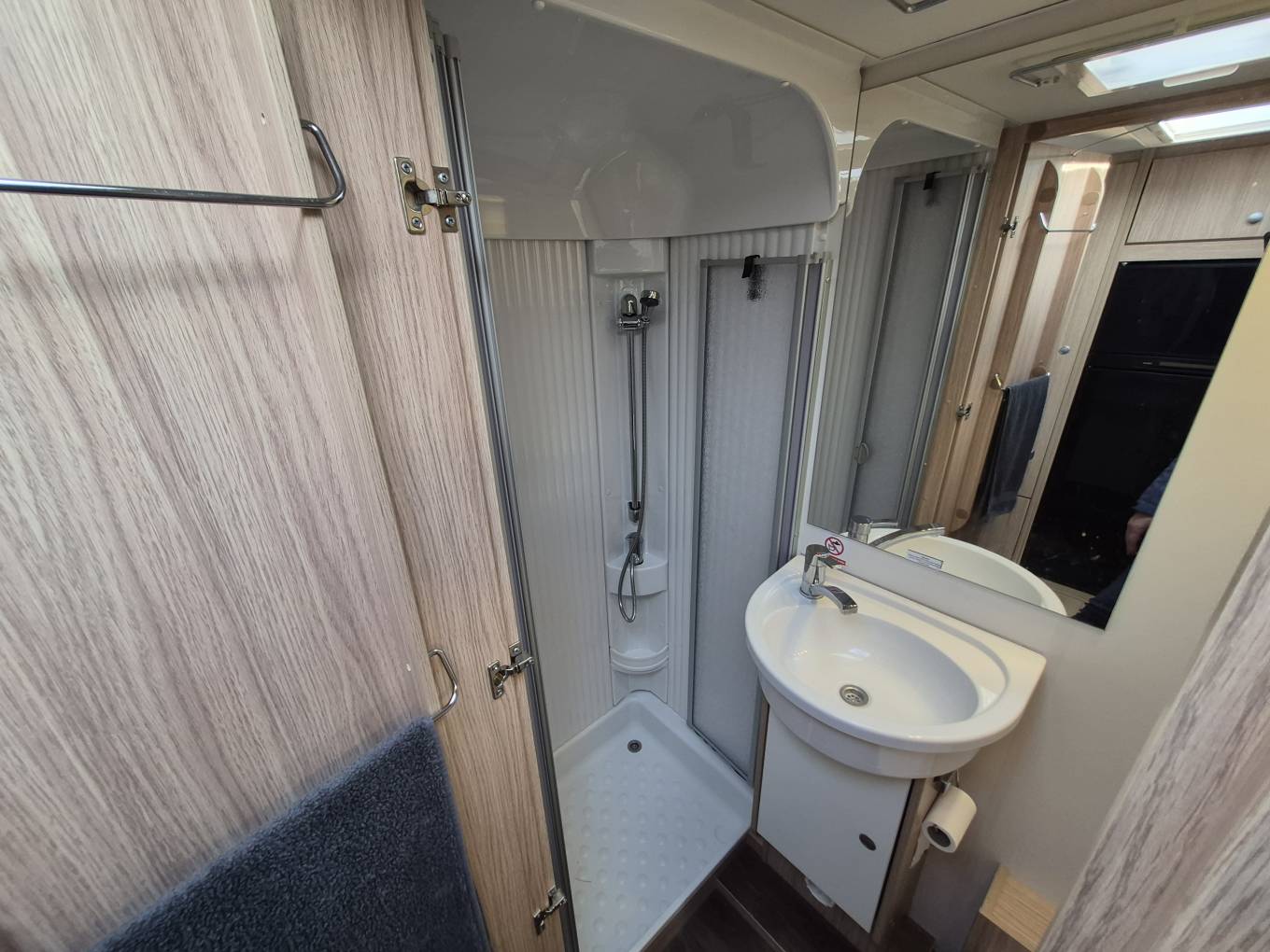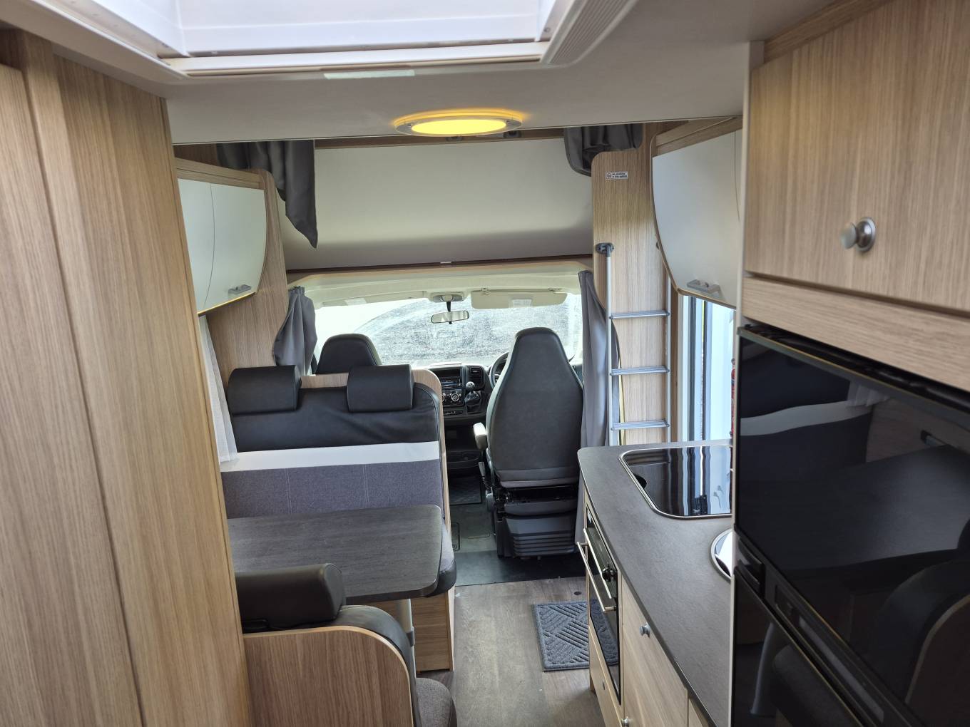 ideal for families or those who love to travel with friends, offering a thoughtfully designed layout, this motorhome combines comfort, storage, and usability for life on the road. At the rear is a fixed double bed offering a spacious and comfortable sleeping area, with a generous garage space located underneath—perfect for larger items or outdoor gear. Adjacent to the bed is the bathroom, which includes a separate shower, sink, and electric flush cassette toilet. The central kitchen is well-equipped, featuring a hob, grill, oven, and sink—everything needed to cook on the move. Opposite the kitchen is a large fridge/freezer with automatic energy selection, keeping your groceries cool no matter where you are. Towards the front, the dinette seats four and easily converts into an additional sleeping area. Above the cab is a large over-cab bed, offering a cozy space for two and easily accessed via a ladder. This Sunlight A70 is in excellent condition and has been well looked after.