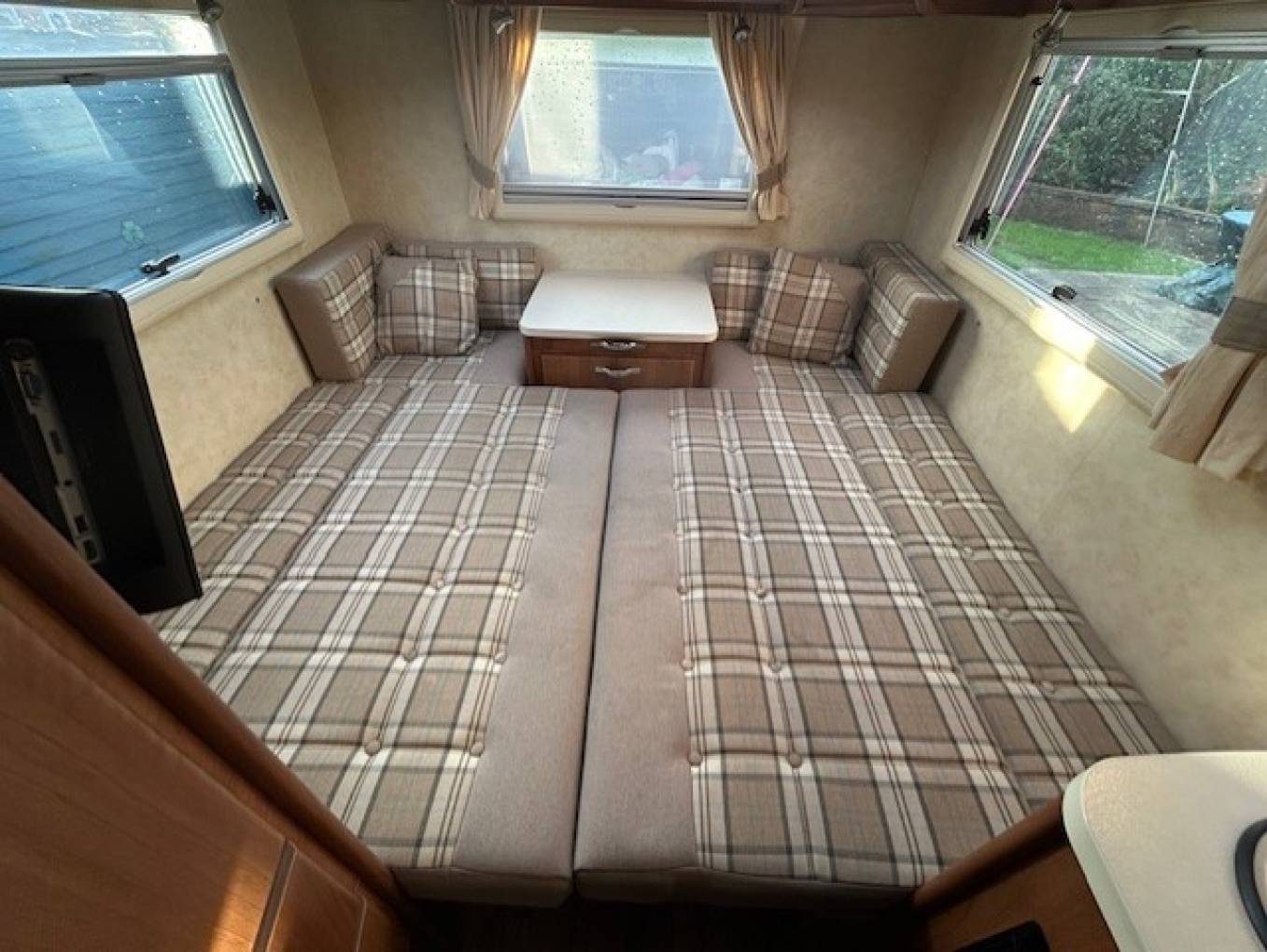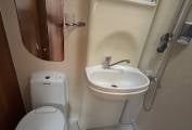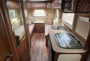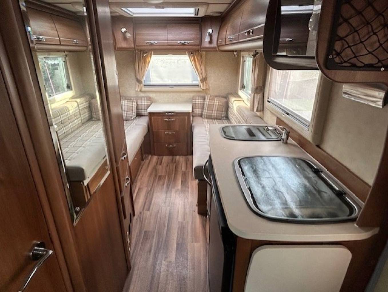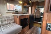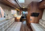 The rear U-shaped lounge transforms into a double bed or can be used as 2 single beds. The dining table can be stowed away whilst driving. Mid ship kitchen is fully functional with a gas hob, oven, grill, sink, 3 way fridge freezer and a microwave. The washroom has a shower, wash hand basin and a cassette toilet.