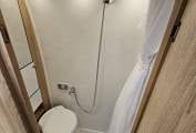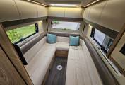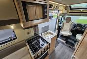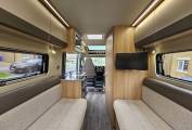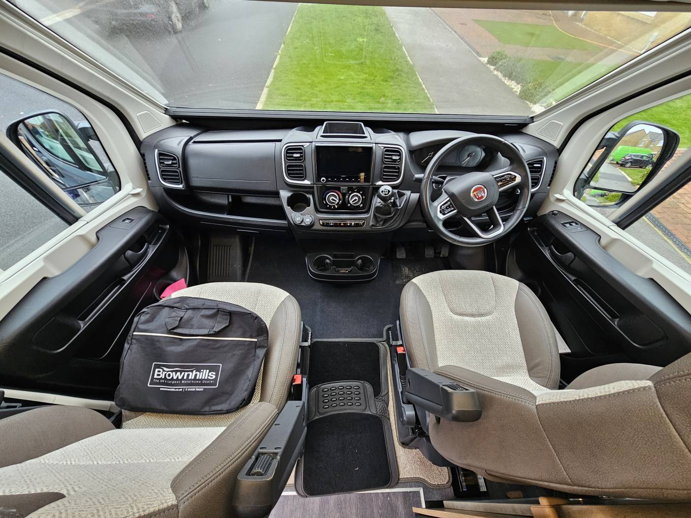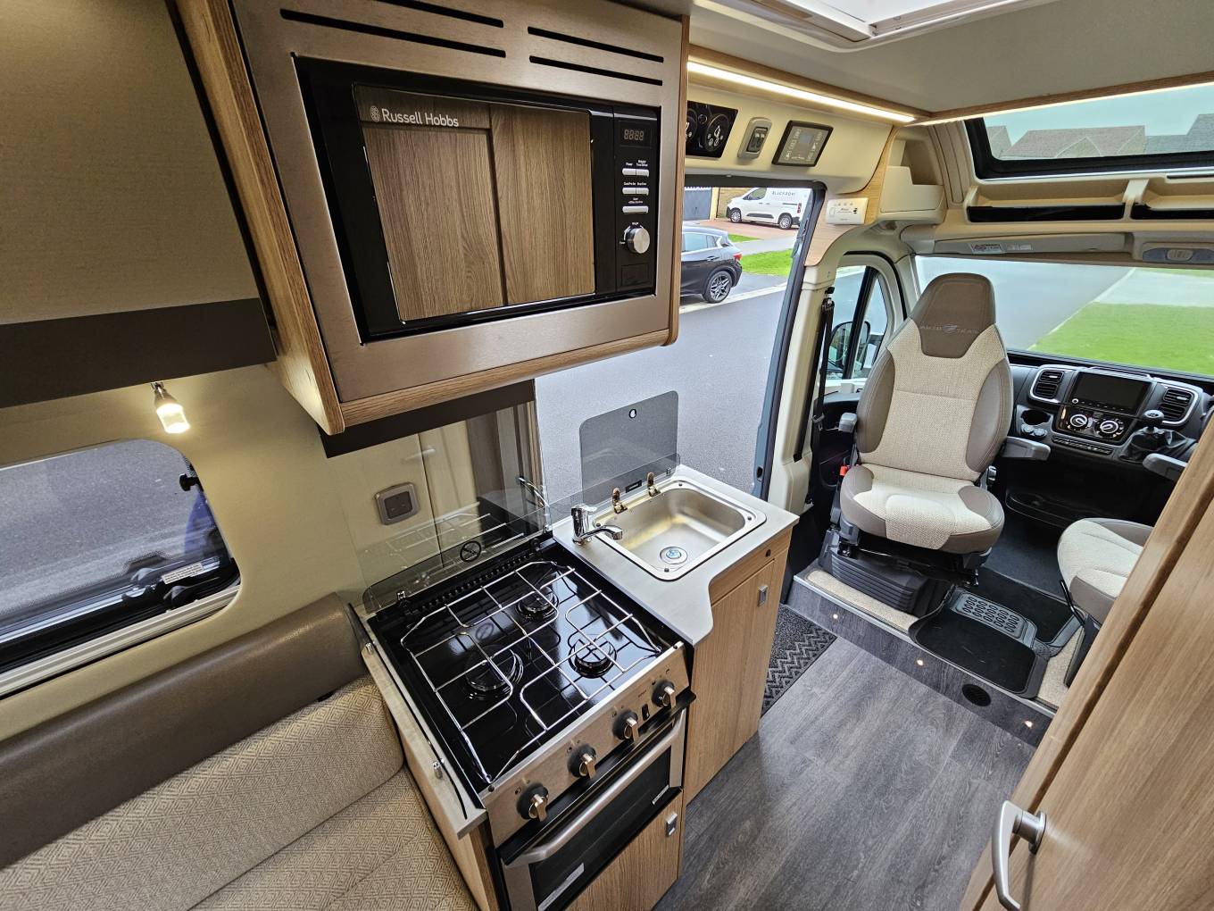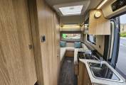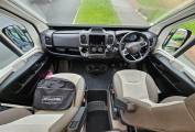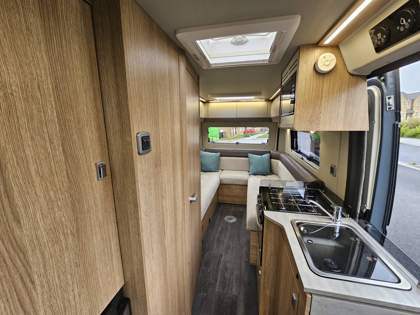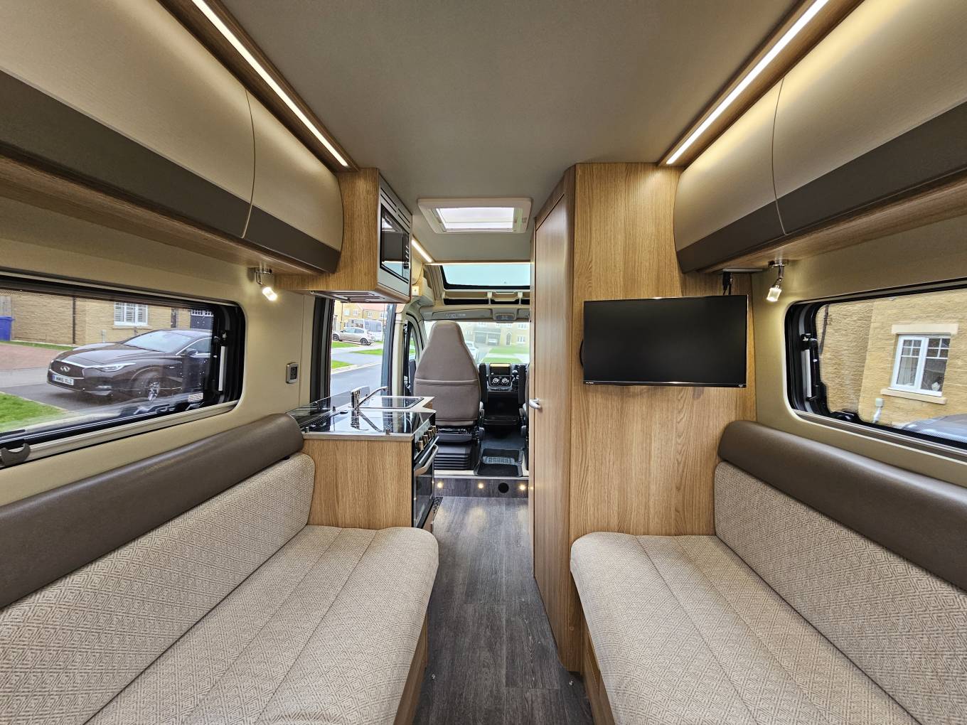 This model is designed for comfort and functionality, with a rear lounge layout featuring two long sofas that convert into a spacious double bed with under storage. Overhead lockers and wide side windows enhance space and light throughout the rear, with blackout blinds and flyscreens included. The central kitchen is well appointed with a three burner hob, oven and grill, microwave, and integrated sink, along with a good amount of storage and prep space. Opposite is a compact wetroom with cassette toilet, basin, and shower and large mirror, all in excellent condition. At the front, both cab seats swivel to create an additional lounge area beneath the large skylight.