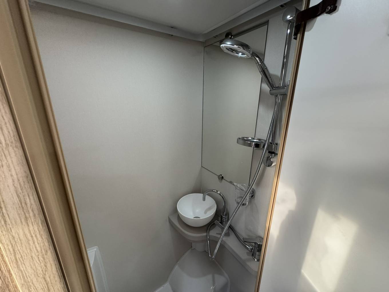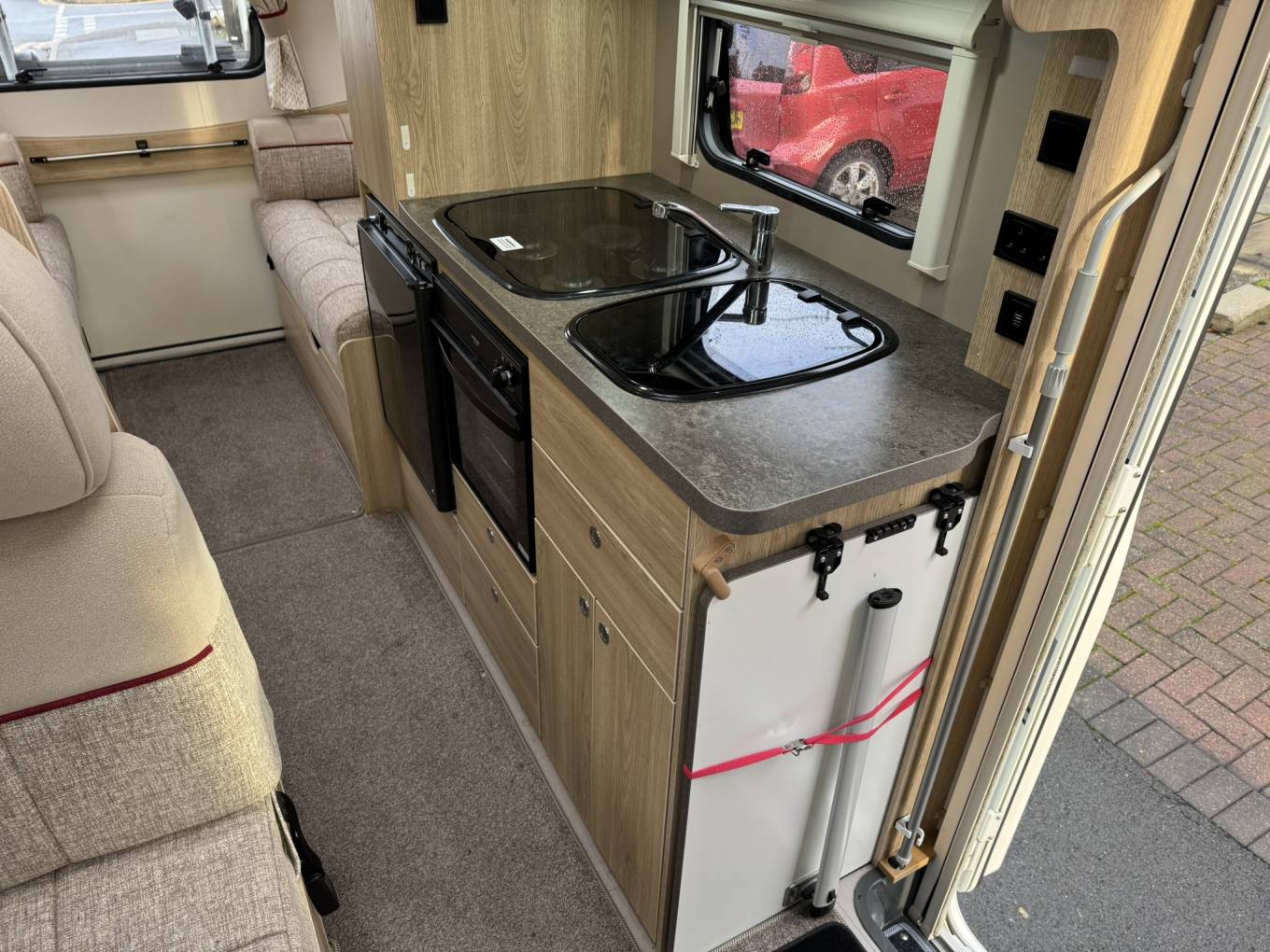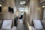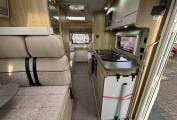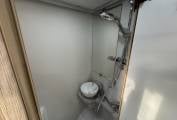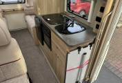 The fully equipped kitchen is ideal for cooking on the move, featuring a Dometic 3-way fridge freezer, Thetford duplex oven and grill, and a 3 gas + 1 electric hob, giving flexibility for both on-hook-up and off-grid cooking. The washroom includes a Thetford cassette toilet, wash basin, offering convenience and comfort for all trips.