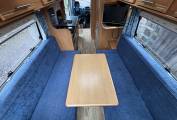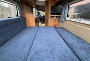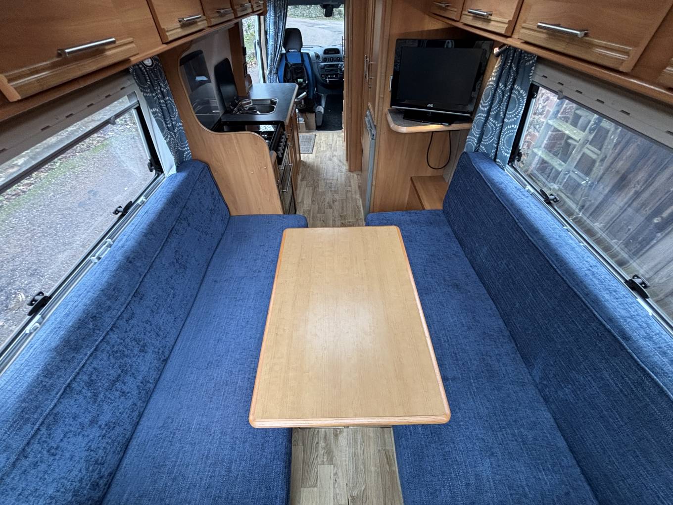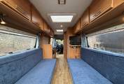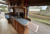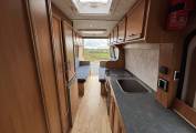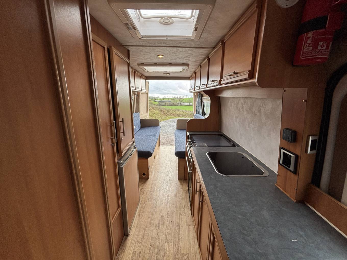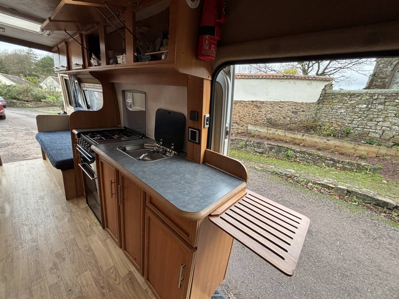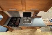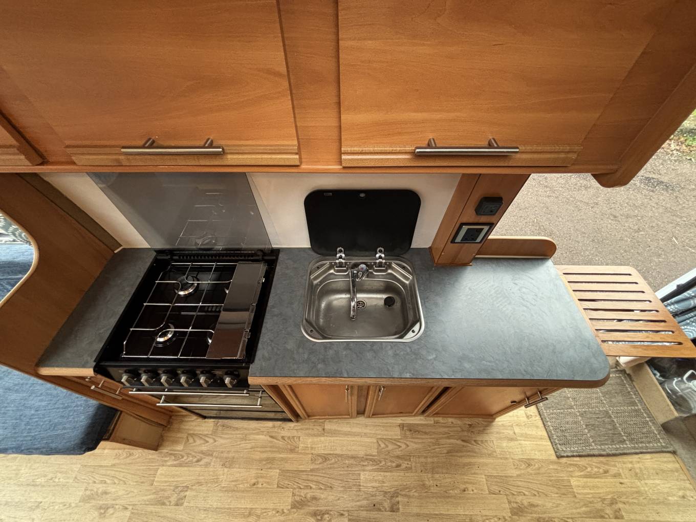 Entering through the habitation sliding door on the passenger side, you’ll find a well‑equipped kitchen immediately to your right. This features a sink with mixer tap, gas oven, separate grill, four‑burner hob, Dometic fridge with ice box, ample worktop space, and storage both at eye level and below counter.