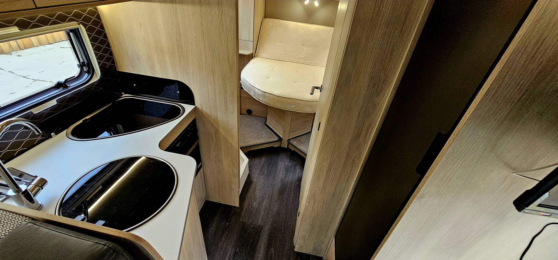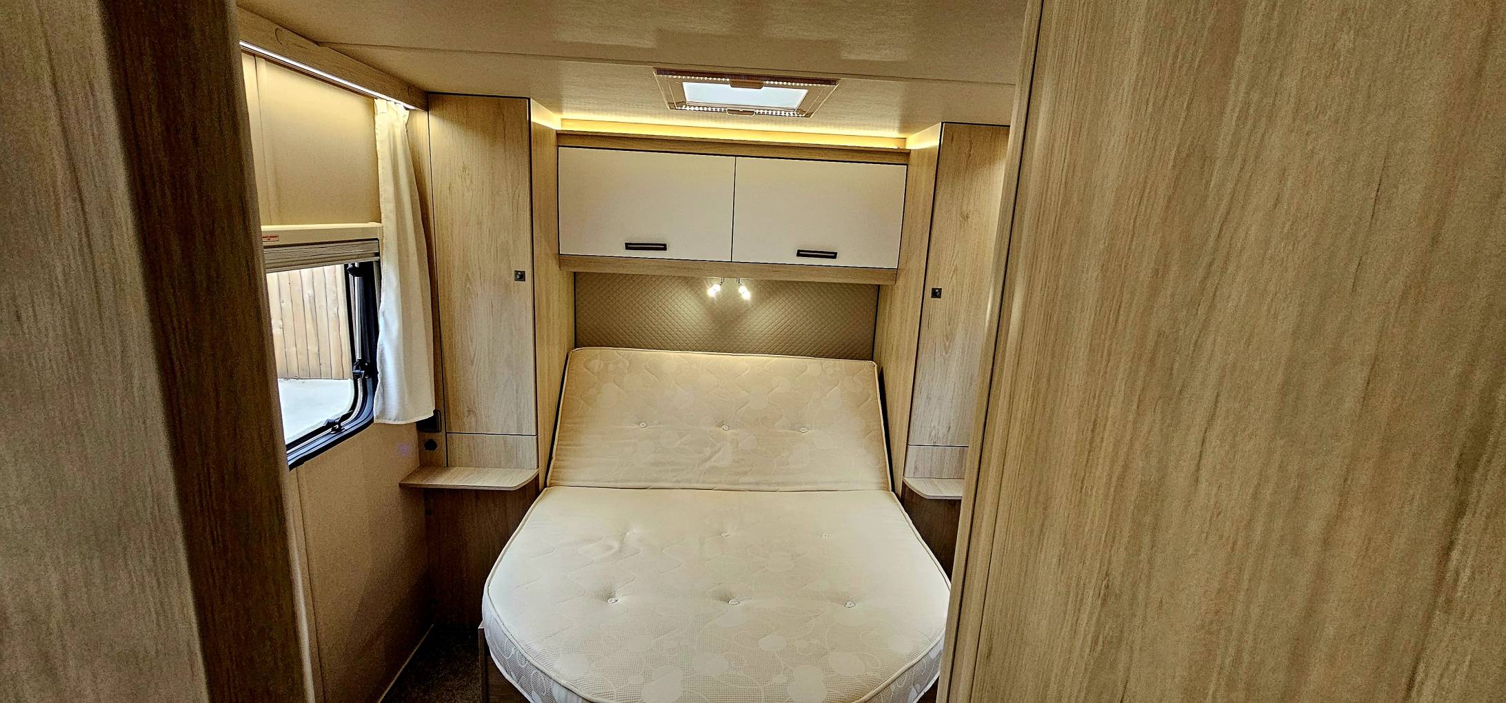 Rear island bed with storage compartments underneath. Bed pushes back in the day time to offer more space and create a day bed.