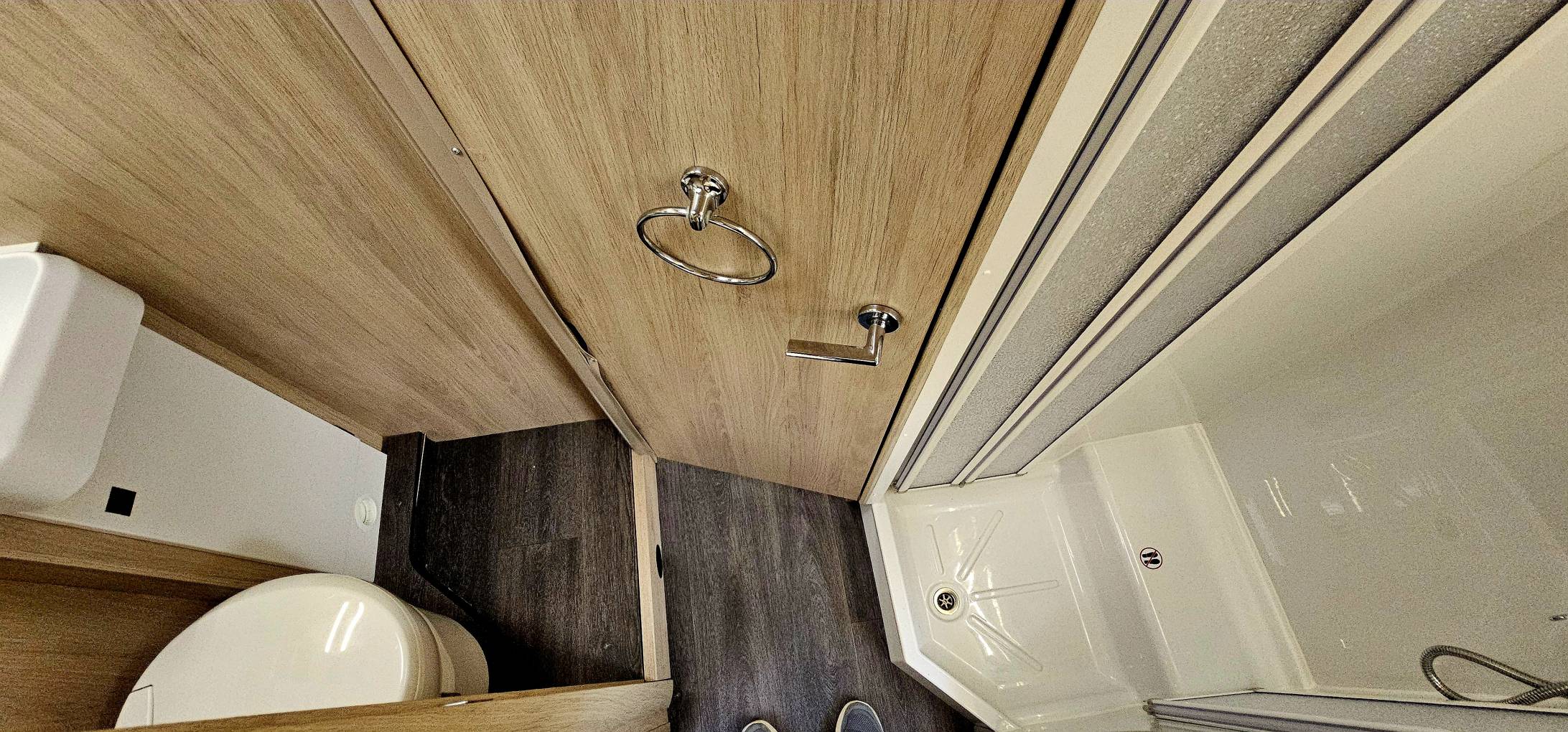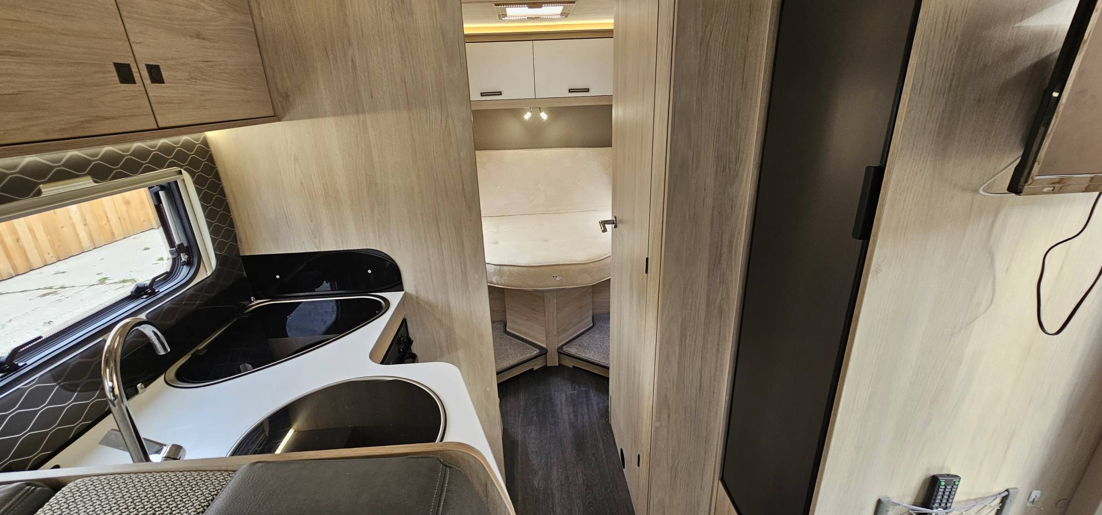 Rear island bed with storage compartments underneath. Bed pushes back in the day time to offer more space and create a day bed.