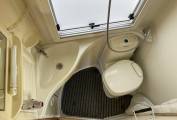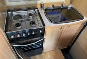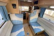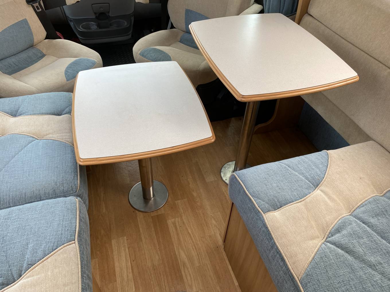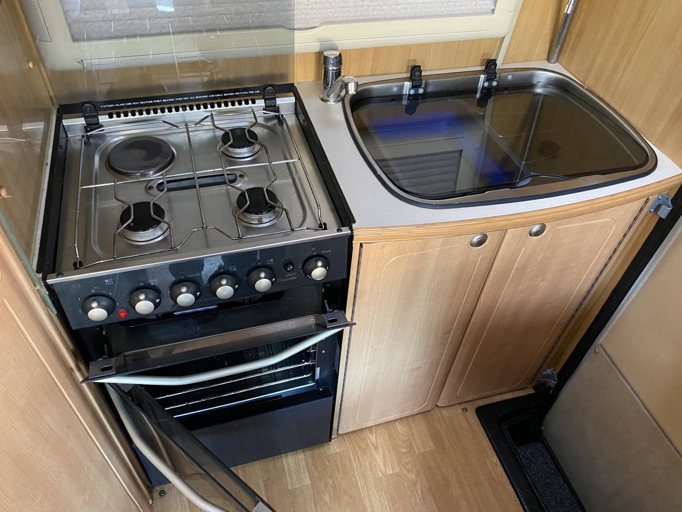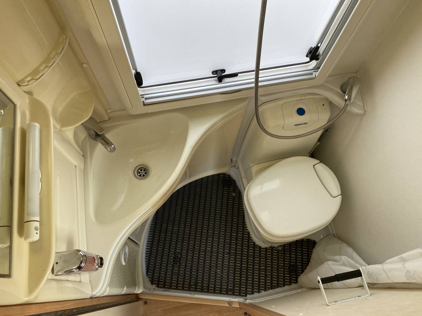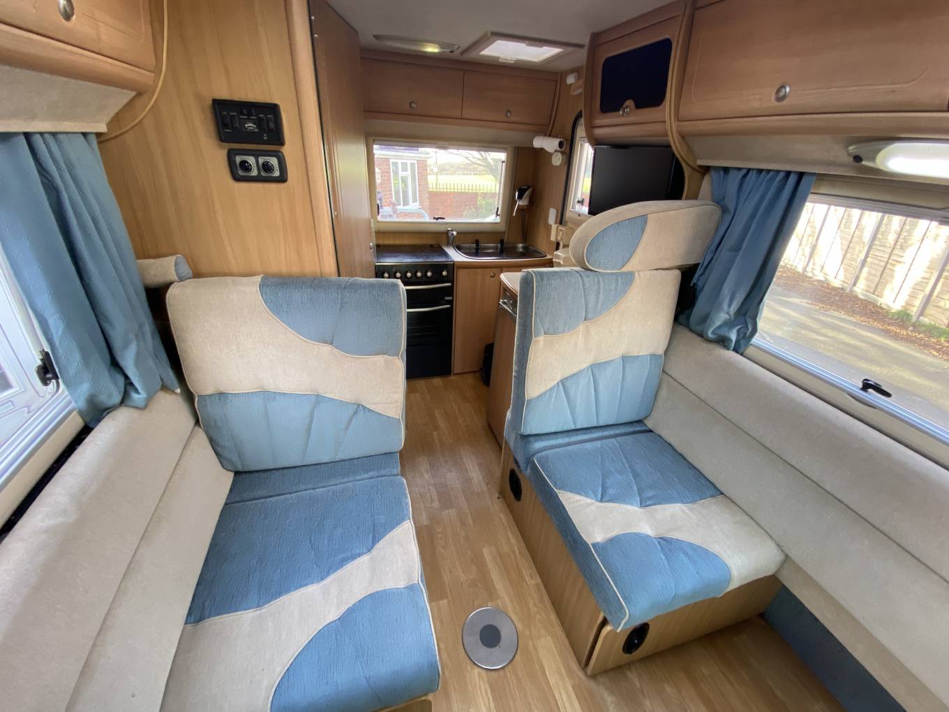 In good condition throughout, commensurate to age and mileage. Starting at the rear is the versatile kitchen area with a stainless sink and drainer unit, additional work top adjacent, above the 3 way combination Dometic fridge freezer with integral ice box fridge, mixer tap, water purifier, 3 gas burner hob with an electric hotplate, Caprice separate grill and oven and is set to the side of the habitation door with good storage. Adjacent is the rear washroom with Thetford swivel action, cassette, flushing toilet, vanity washbasin and mirrors, medicine cabinet, opening opaque side window, skylight and a curtained integral shower.