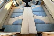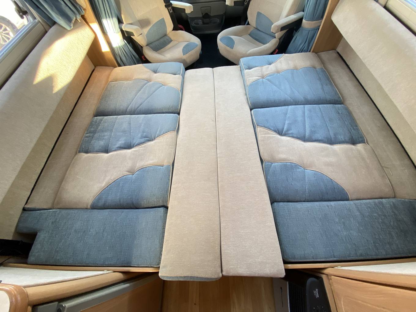 Moving forward into the highly adaptable central seating area with a choice of tables and positioning, the comfortable single seating converts easy with a sliding mechanism to turn into two parallel sofa options which are in good condition. The sofas can be made up into a large full width double bed. A good sized overcab double bed is easily accessed via a ladder, which doubles up as an ideal and useful storage area when not being used. Both cab seats swivel round to face the living area and the driver enjoys, air conditioning, air bag, electric front windows, Pioneer DEH-5720DAB radio, electrically adjusted wing mirrors and there are both internal and external silver screens for the cab front windows. Specification includes fly screens and blinds, large opening central roof light, panoramic lounge windows, lots of storage space throughout and Truma space heating and hot water. Includes a TV and removable carpets.