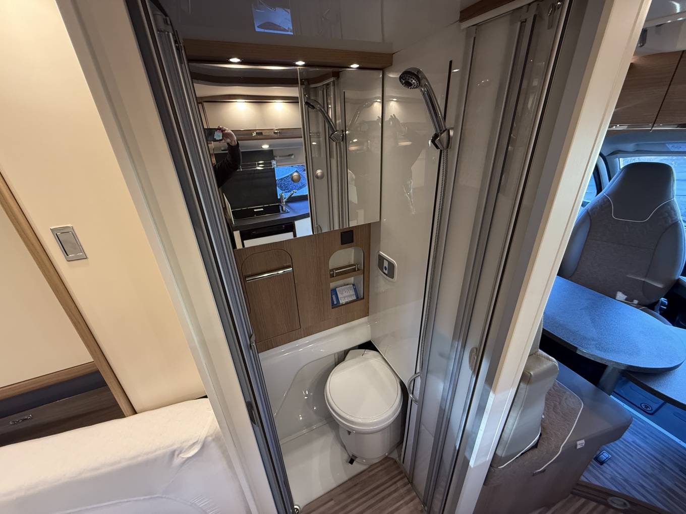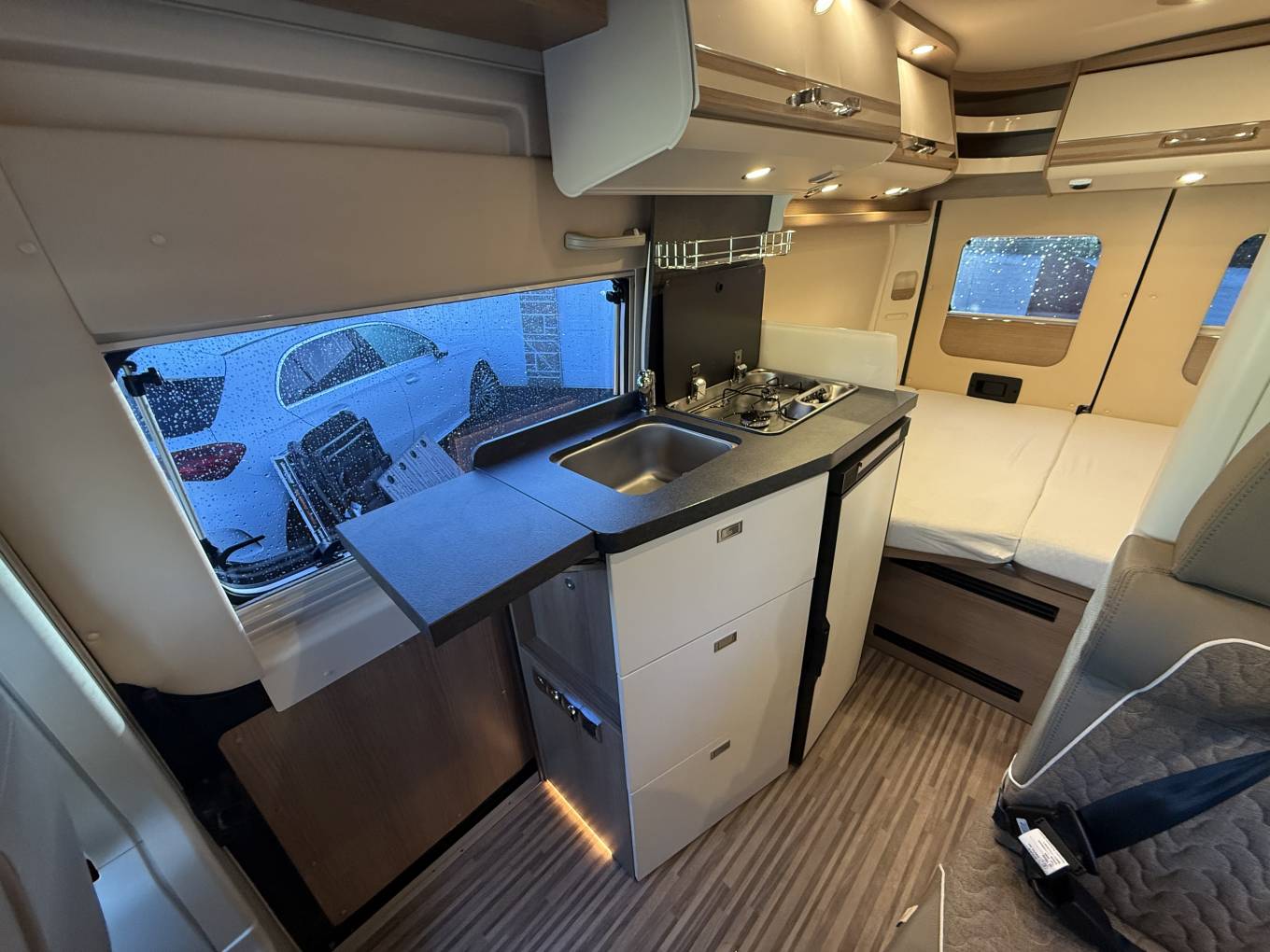 The layout is from the front you have the modern and light lounge area which has 2 forward facing seats and 2 captains swivel seats with a table that can be stowed away when required and an Avtex TV with aerial fitted. Above this is the entrance to the pop top sleeping area. Midship you have the side kitchen area which has a 2 ring gas hob, sink, undercounter fridge with freezer and lots of storage and drawers. Opposite is the side washroom with sliding toilet that creates an enclosed shower cubicle with a fold away sink and storage. To the rear is the fixed double bed with storage underneath and for extra storage when travelling this area can become a large garage area by lifting the bed.