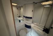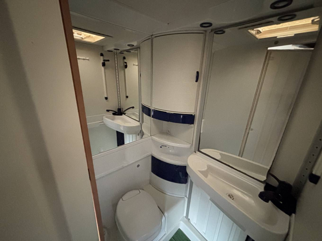 • Self-Contained Washroom: Cassette toilet, sink, vanity mirror, storage, and overhead shower.