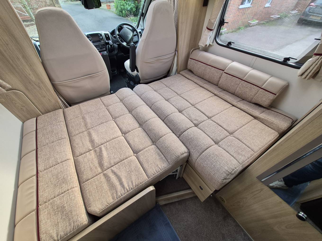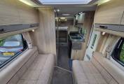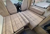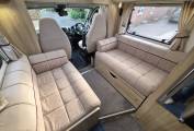 Behind the cab is the main habitation dining/leisure area which is very light and airy with large windows allowing plenty of natural light to enter, with two opposing side bench this area can be augmented with the use of a free standing table and the two swivel cab seats. The sofas can be easily converted into a transverse double berth, and, stowed underneath the sofas, this area can also be reconfigured with two forward facing belted travel seats.