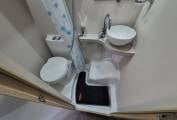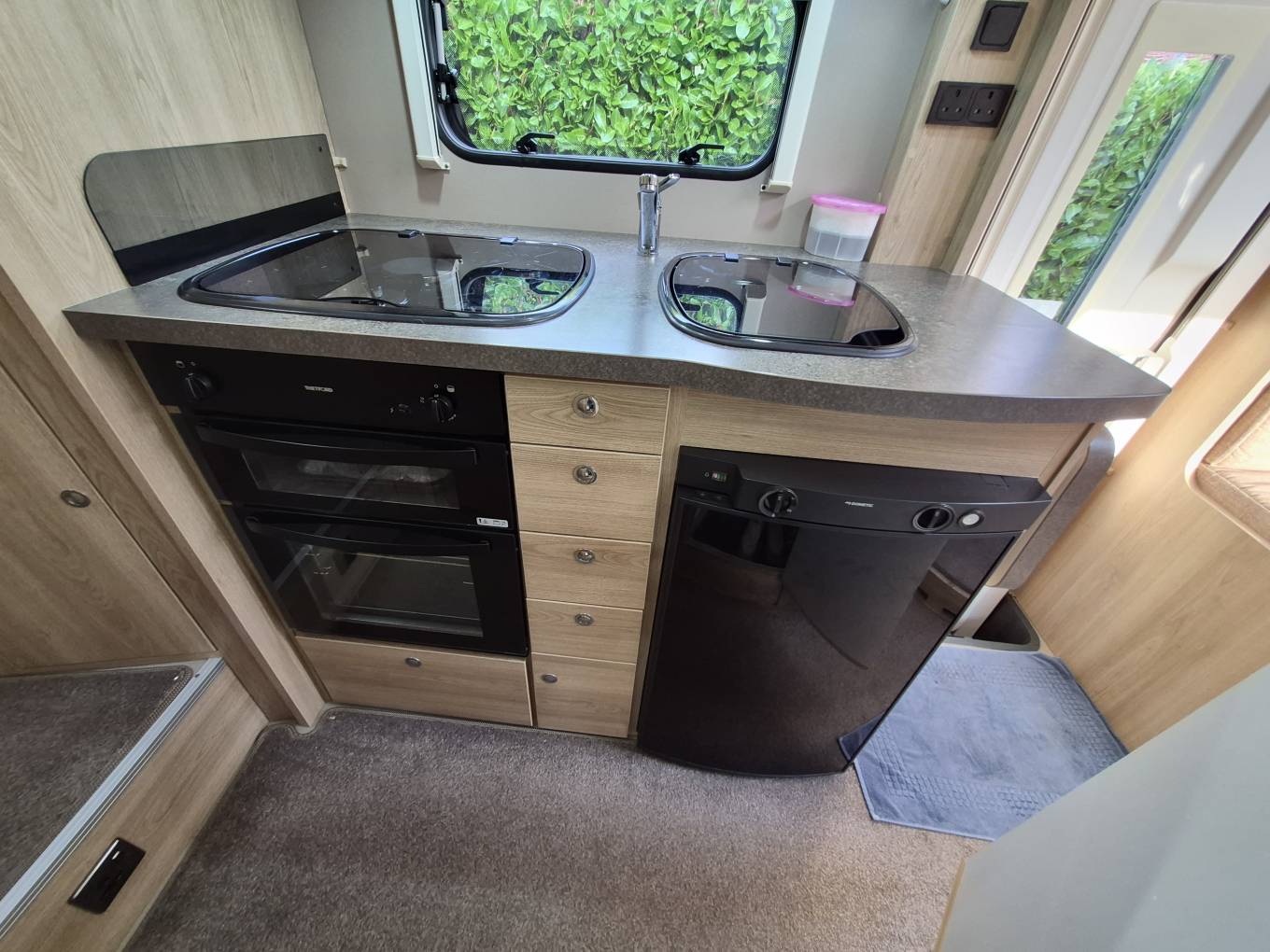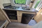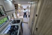Beyond the sofas, and following the nearside habitation door is the central galley kitchen, well equipped with a cooker that has oven, grill, 3 gas burners, 1 electric hob; Dometic fridge with freezer, microwave plenty of storage and a useful pop-up worktop food preparation area next to the habitation door, which has a flyscreen.