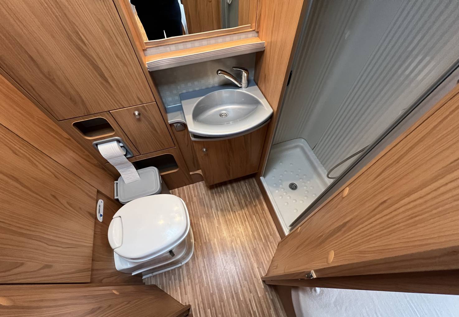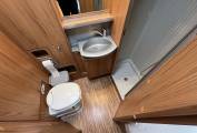 The rear washroom includes sink, toilet and shower with full enclosure. There is plenty of storage space in here included shelves and handing space in the wardrobe. Underneath, there is full width storage, for items that can be folded, such as chairs, with external access from both sides of the motorhome.