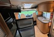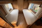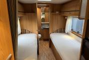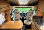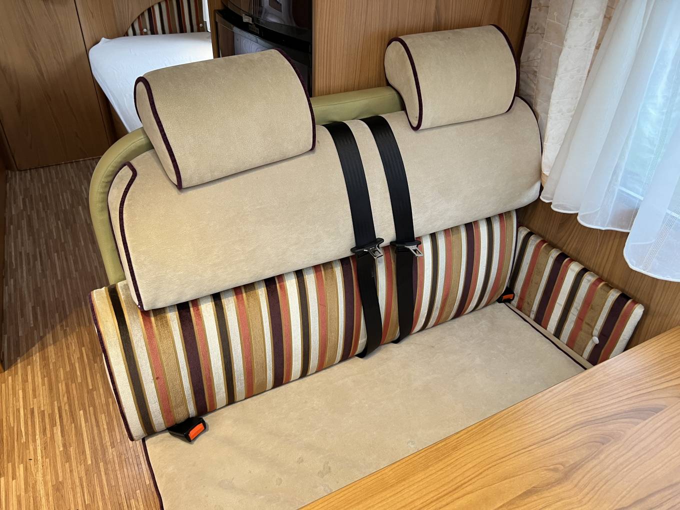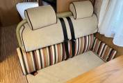 There is fabric upholstery throughout and in the front dinette, there are 2 travelling seatbelts, plus additional storage above. A very occasional bed can be created in the dinette and the table has an extension if required.