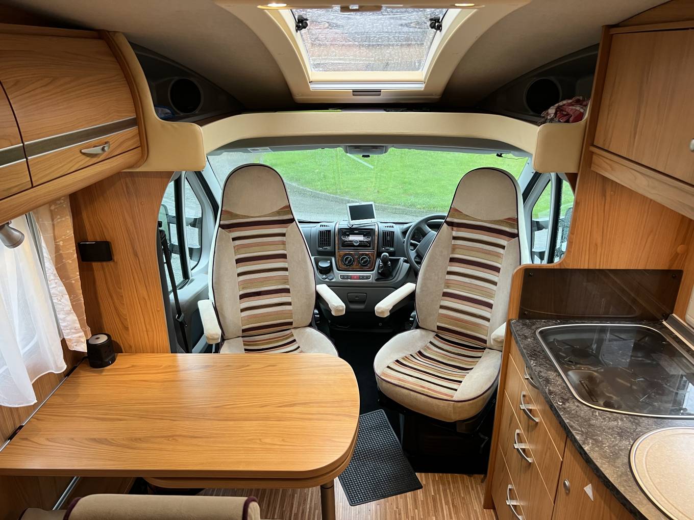 Upfront, there are 2 swivel seats, removeable blinds on the windscreen, DAB radio with Bluetooth, rear view camera, 6 speed manual gearbox, cruise control plus electric windows and mirrors.