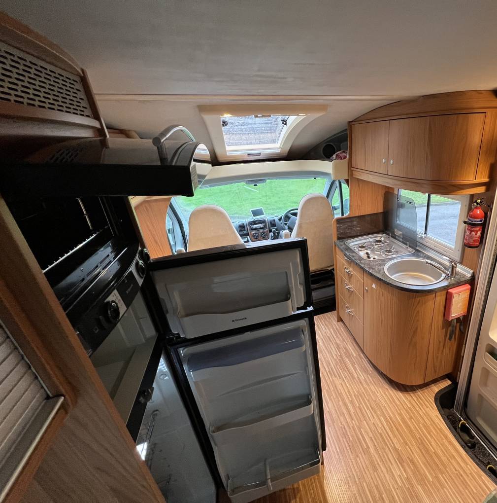 The kitchen covers both sides of the motorhome, with large fridge/ freezer, with oven/ grill above, situated on the nearside and then hob, with 3 gas burners and sink opposite, next to the habitation door. There is also pull out TV.