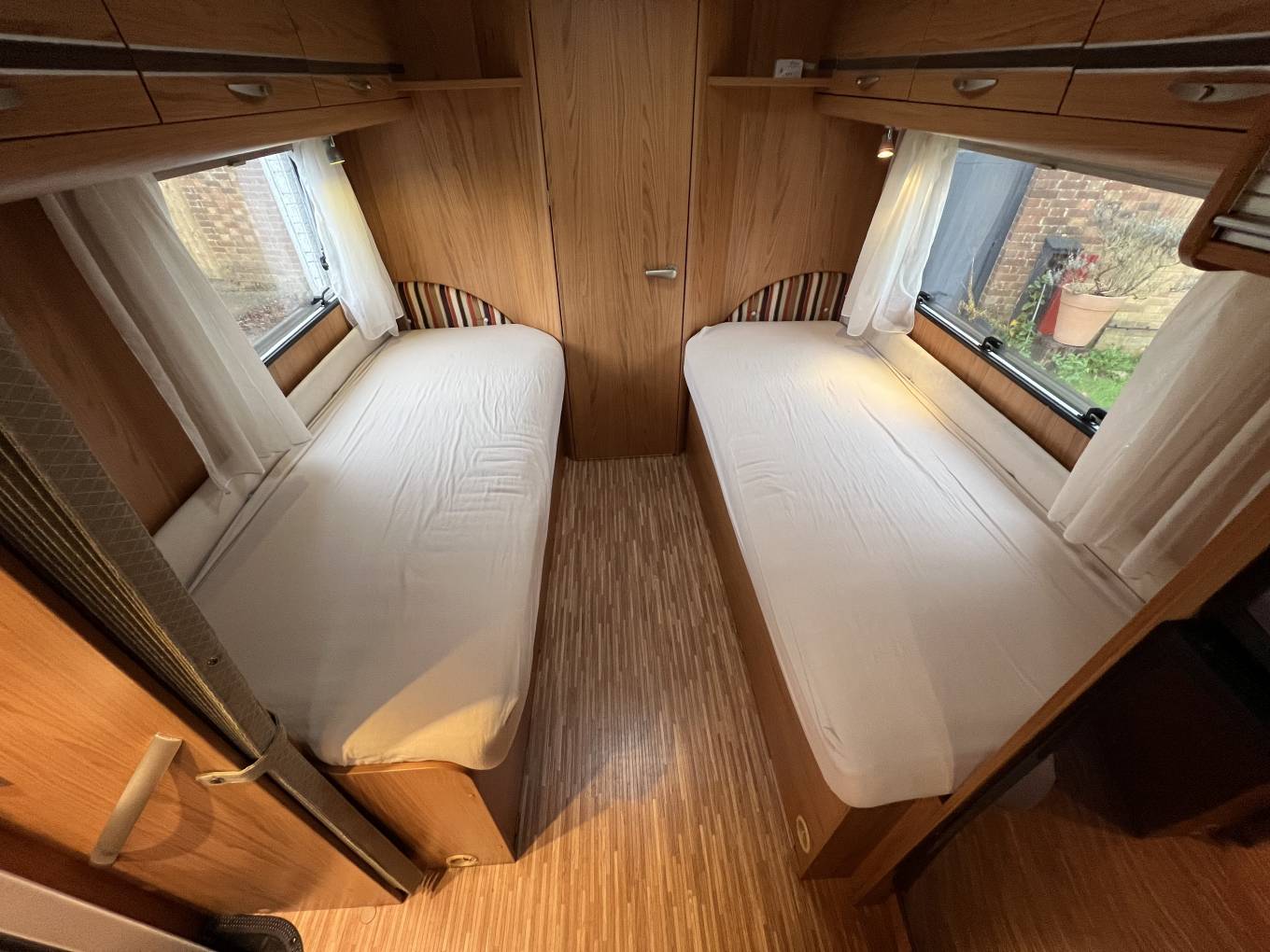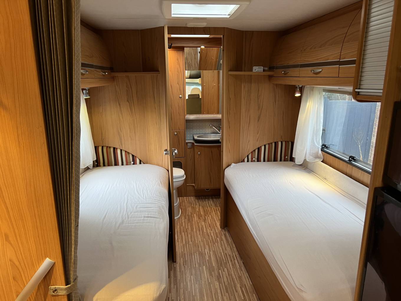 The basic layout is the rear washroom, then 2 single beds, kitchen and dinette, then 2 swivel seats upfront. There is plenty of storage space throughout.