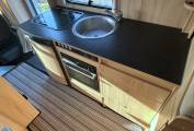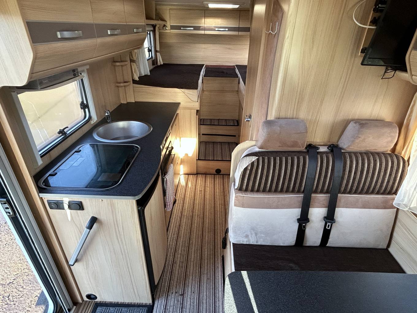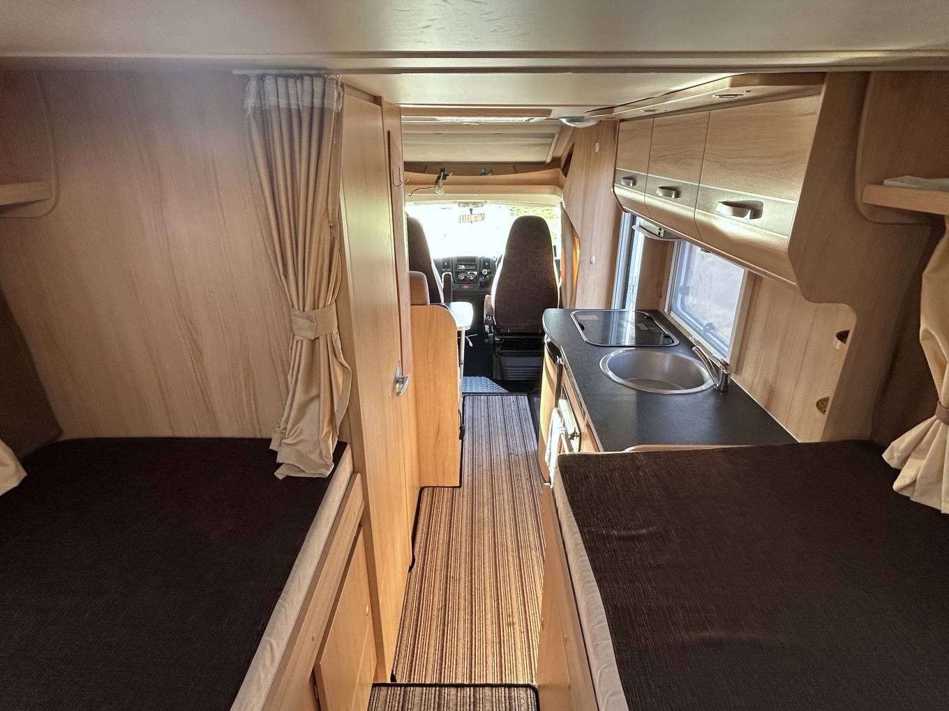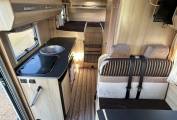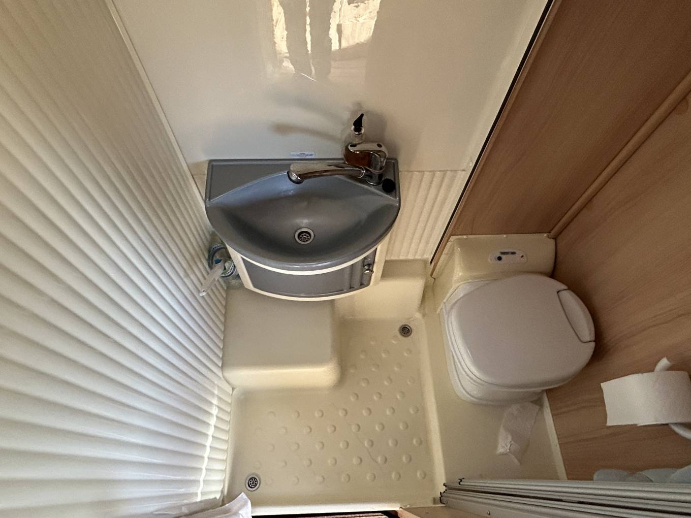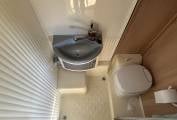 Designed with comfort and practicality in mind, this motorhome is ideal for both extended touring and shorter getaways. The large rear garage provides excellent storage space for outdoor furniture, bicycles or touring equipment, making it perfectly suited to long-term travel. Externally, it is equipped with a wind-out awning for effortless outdoor living, while the fitted solar panel helps keep the leisure battery topped up when off-grid. Inside, the fixed rear bed offers superb flexibility, easily configured as either a generous king-size bed or two comfortable single beds. The spacious washroom is well appointed with a showerhead, Thetford cassette toilet, wash basin with mixer tap, and two storage units to neatly organise toiletries.