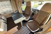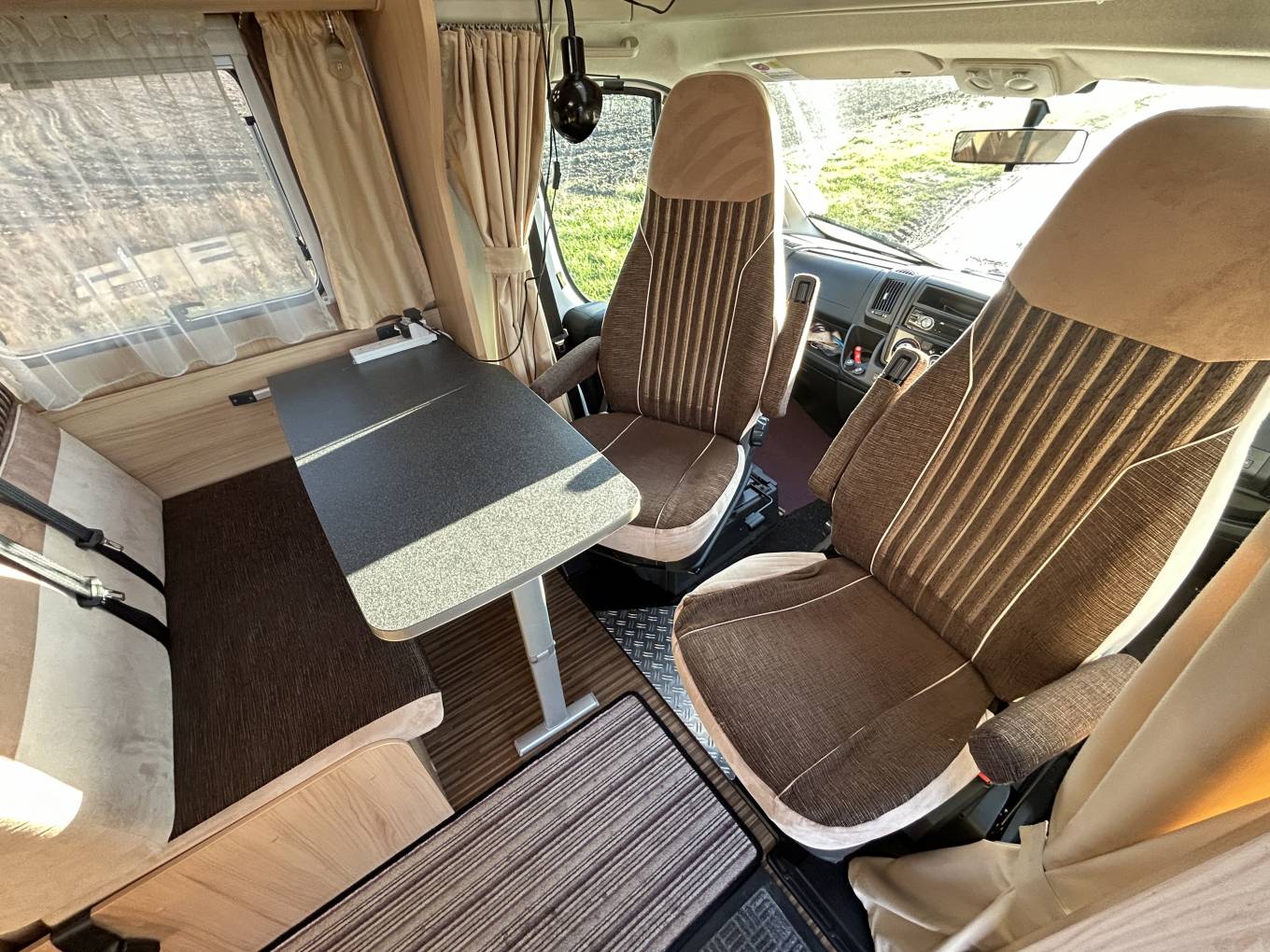 The front lounge area is equally impressive, featuring a forward-facing two-seater sofa with two seatbelts, allowing four people to travel safely. This area can also be converted into an additional single bed when required, making the motorhome a practical three-berth. Both cab seats swivel to create a sociable living space, while features such as cab air conditioning, cruise control, and a reversing camera enhance driving comfort and ease.