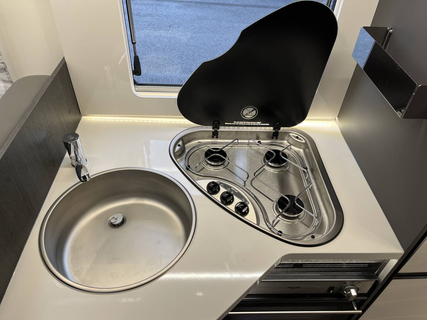 • Generous kitchen area with hob, oven, fridge/freezer, sink |