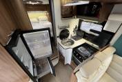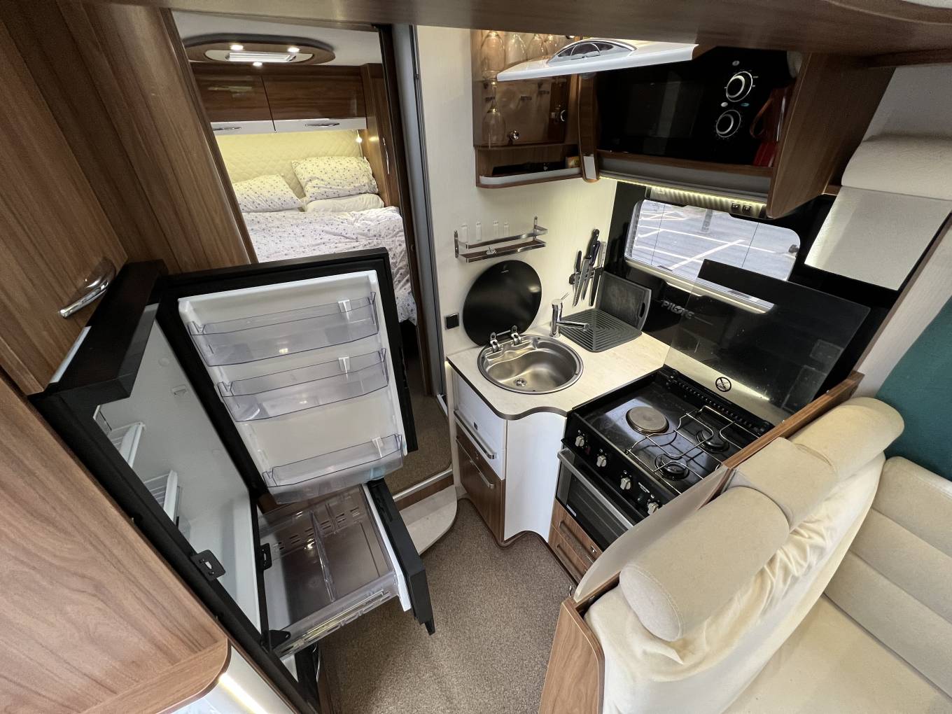 In the kitchen, is a cooker with 2 gas burners, plus electric hob, then oven and grill, plus microwave. The large fridge freezer is electric only working on mains and 12v supply. A TV is stored here and can be viewed in the bedroom or dinette