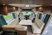 It has fabric upholstery throughout, with seat protectors. In the front dinette, there is small sofa by the habitation door, plus 2 forward facing travelling seats with seat belts. The table can be moved to create an area for several people to sit down.