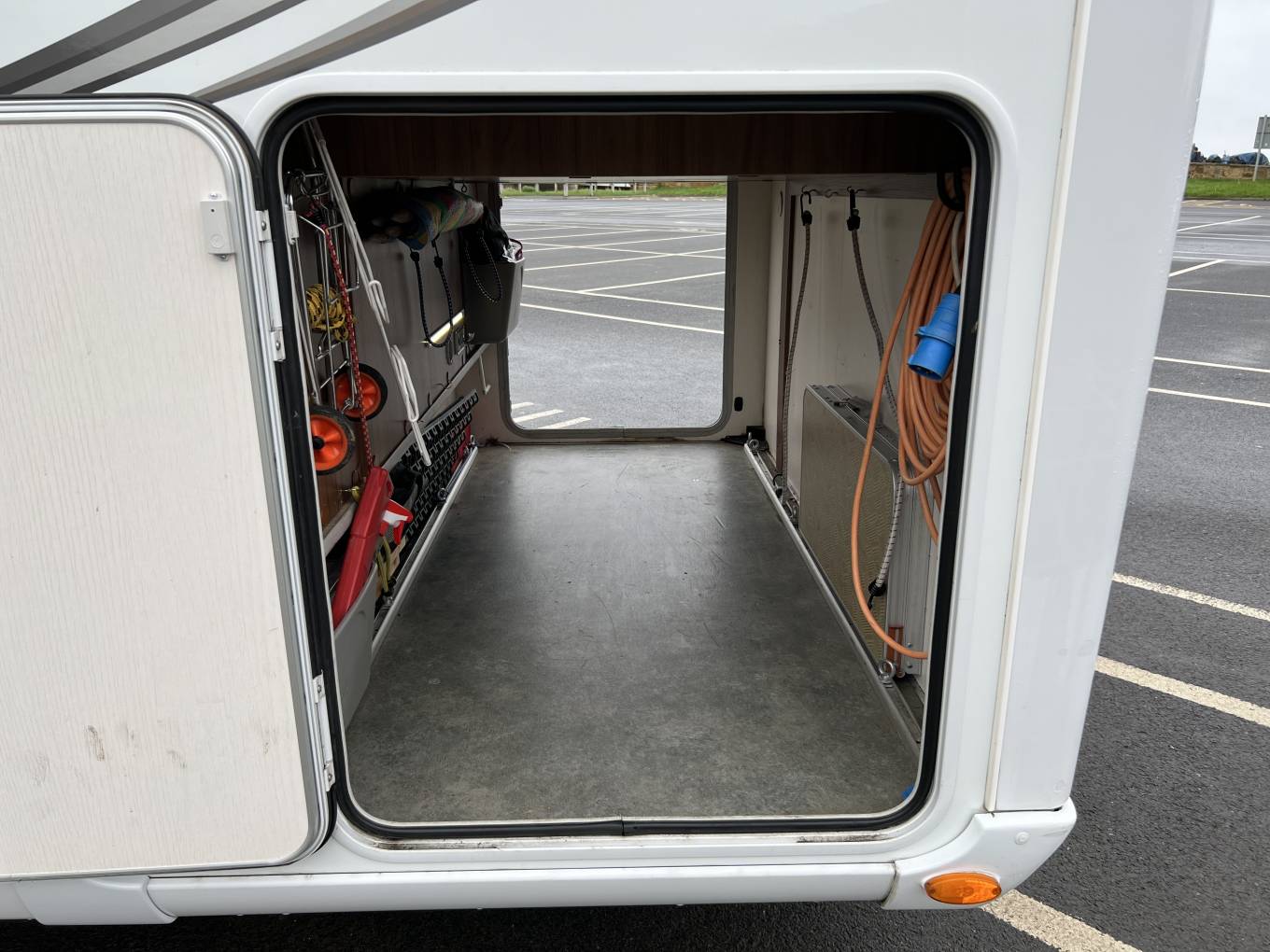 The rear garage has plenty of space for storage and opens on both sides of the motorhome.