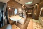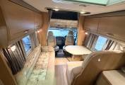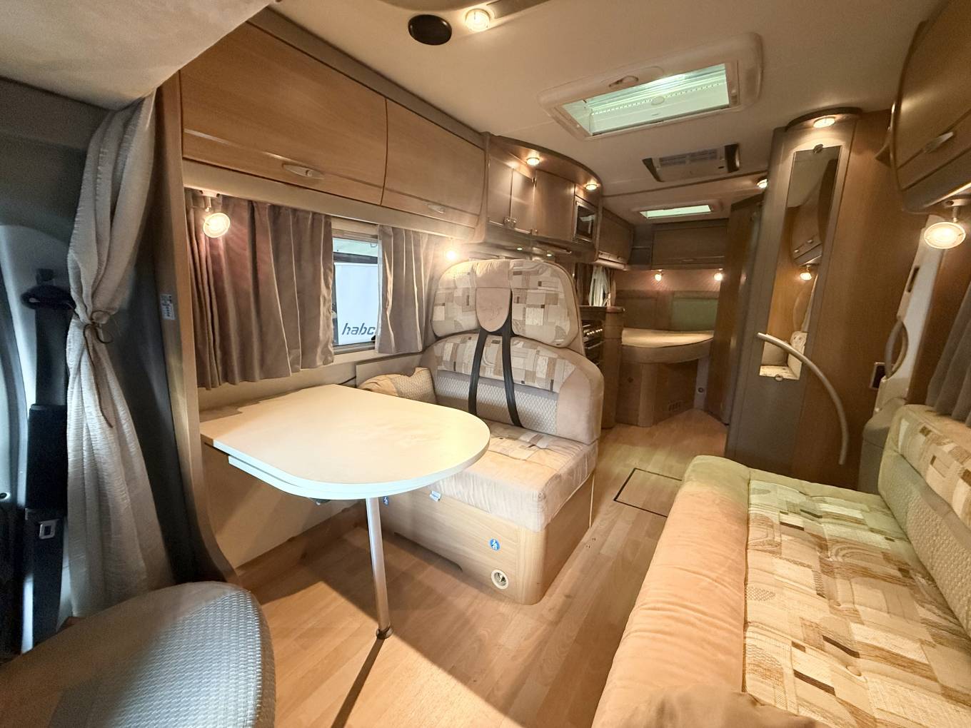 As you enter the habitation you notice the very open and airy layout. In the Centre you have a lovely modern Centre lounge with a removal dining table, a long bench seat with a forward facing dinette which accommodates the forward facing seat belts and the 2 swivel seats for additional seating. The seat benches can be converted to a large double bed.