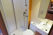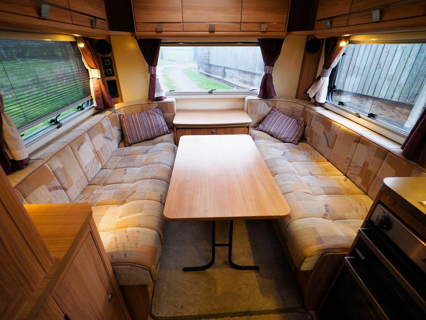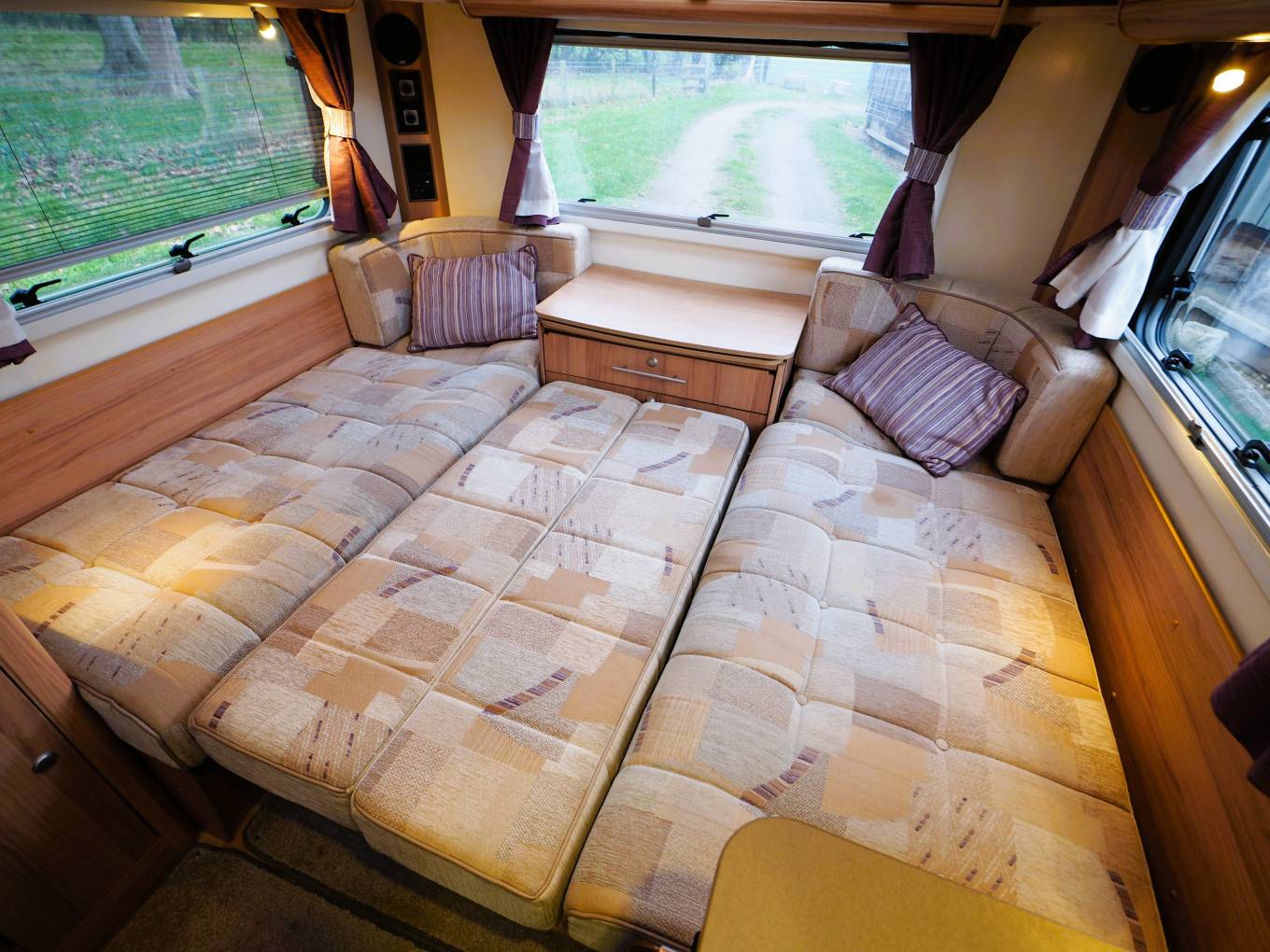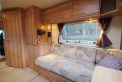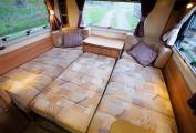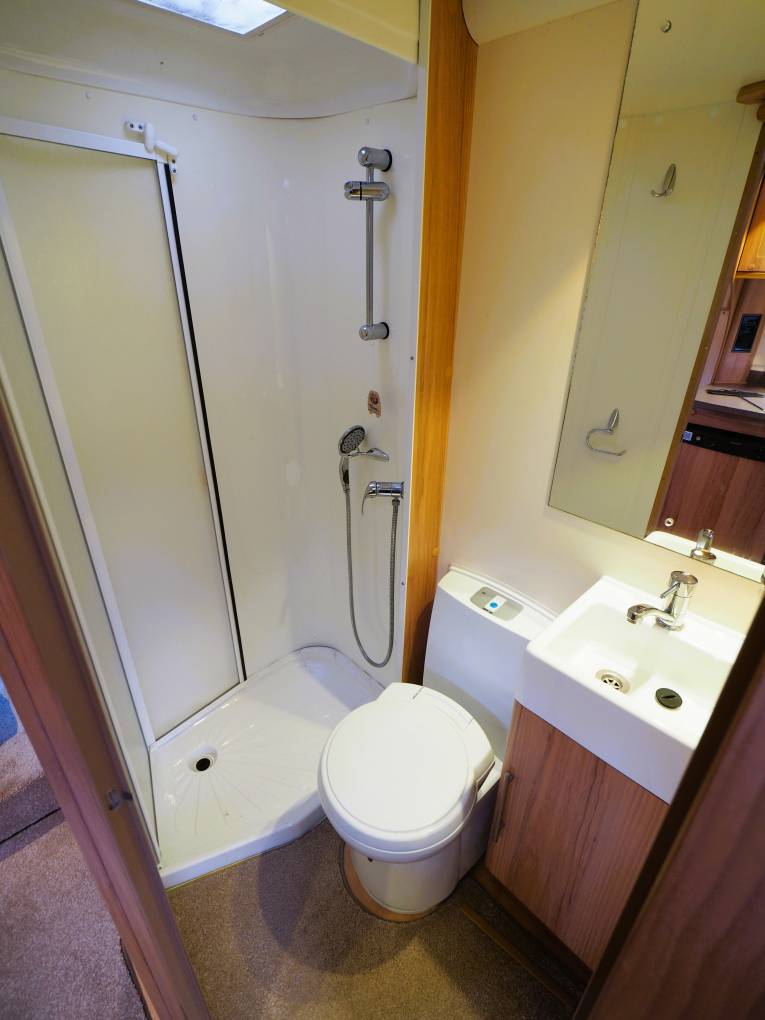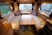 The comfortable and spacious lounge has the option of two side sofas with a central drawer unit with extendable coffee table top or comes with the additional cushions (still in original packaging) to convert to a U-shaped lounge. Plenty of natural light from the windows to all 3 sides and skylight. Drop in the larger dining table for a great place to dine and entertain. Use the 2 side sofas as single beds or pull it out to a good sized double for a comfortable nights sleep. The central kitchen provides plenty of storage and is fitted with a 3 burner gas hob and electric hotplate, oven and grill, microwave oven, sink with mixer and 3-way fridge freezer. The private washroom with flushing cassette toilet, washbasin with mixer, vanity mirror and storage and a separate shower cubicle provides home from home comfort.