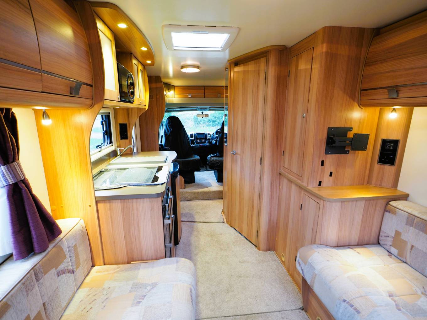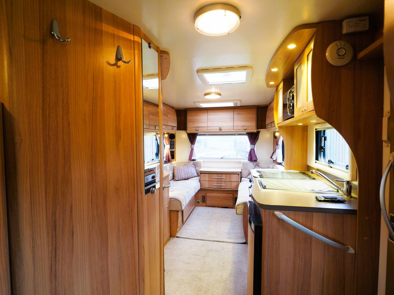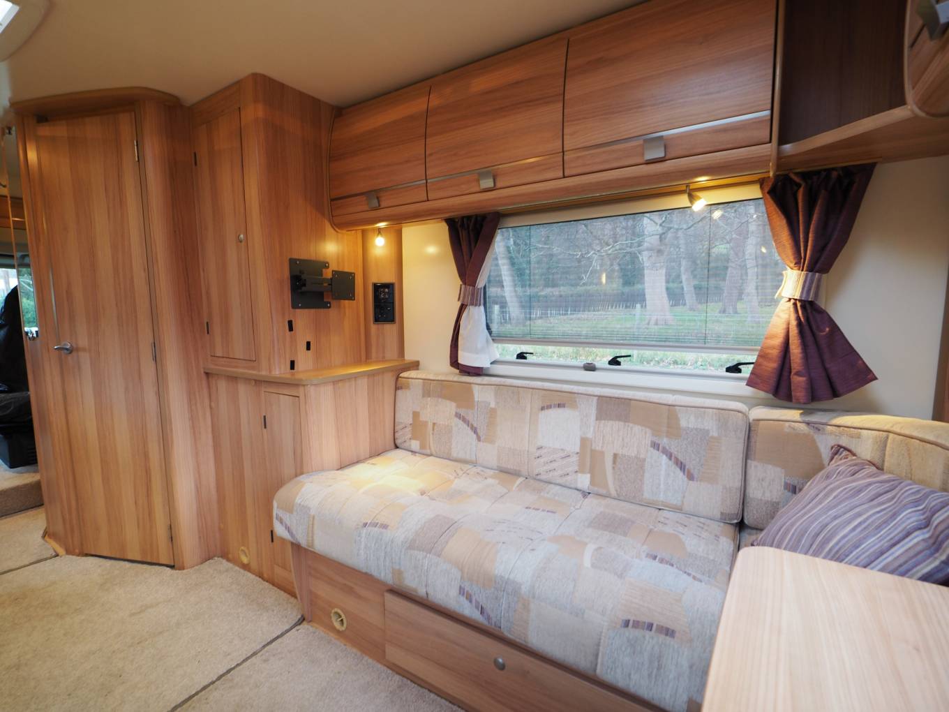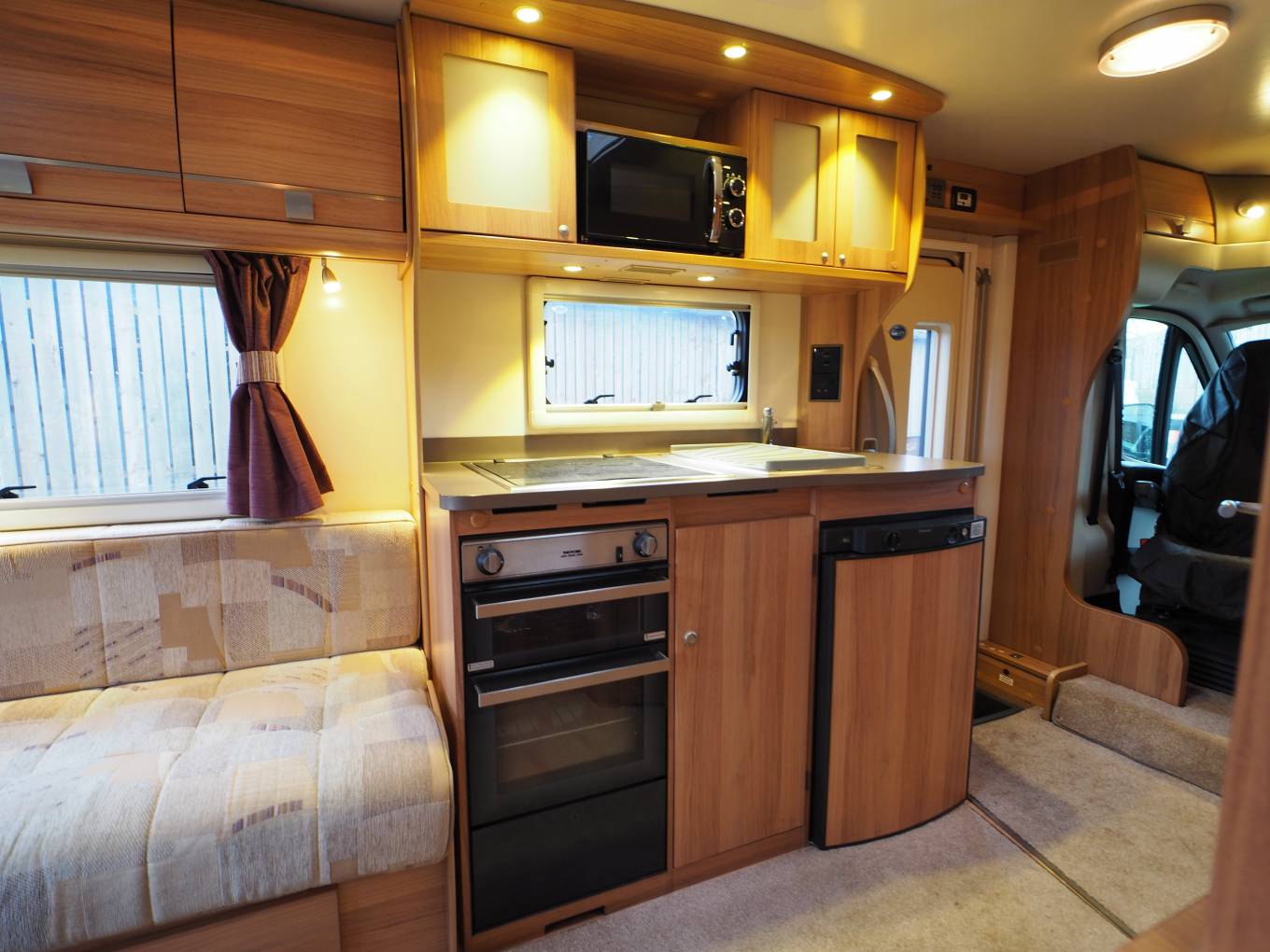 Externally there a rear tow bar and roof mounted solar panel to support the 12v leisure battery. The usual access points for the 230v electric hook-up, gas locker, water point and drain taps and a Fiamma wind out sun canopy. Heating and hot water is from the duel-fuel Truma system.