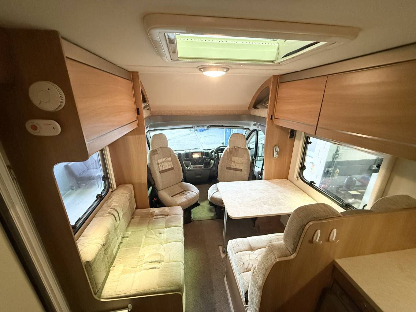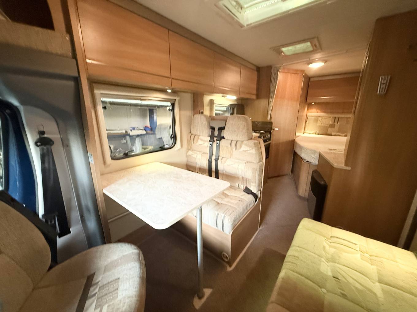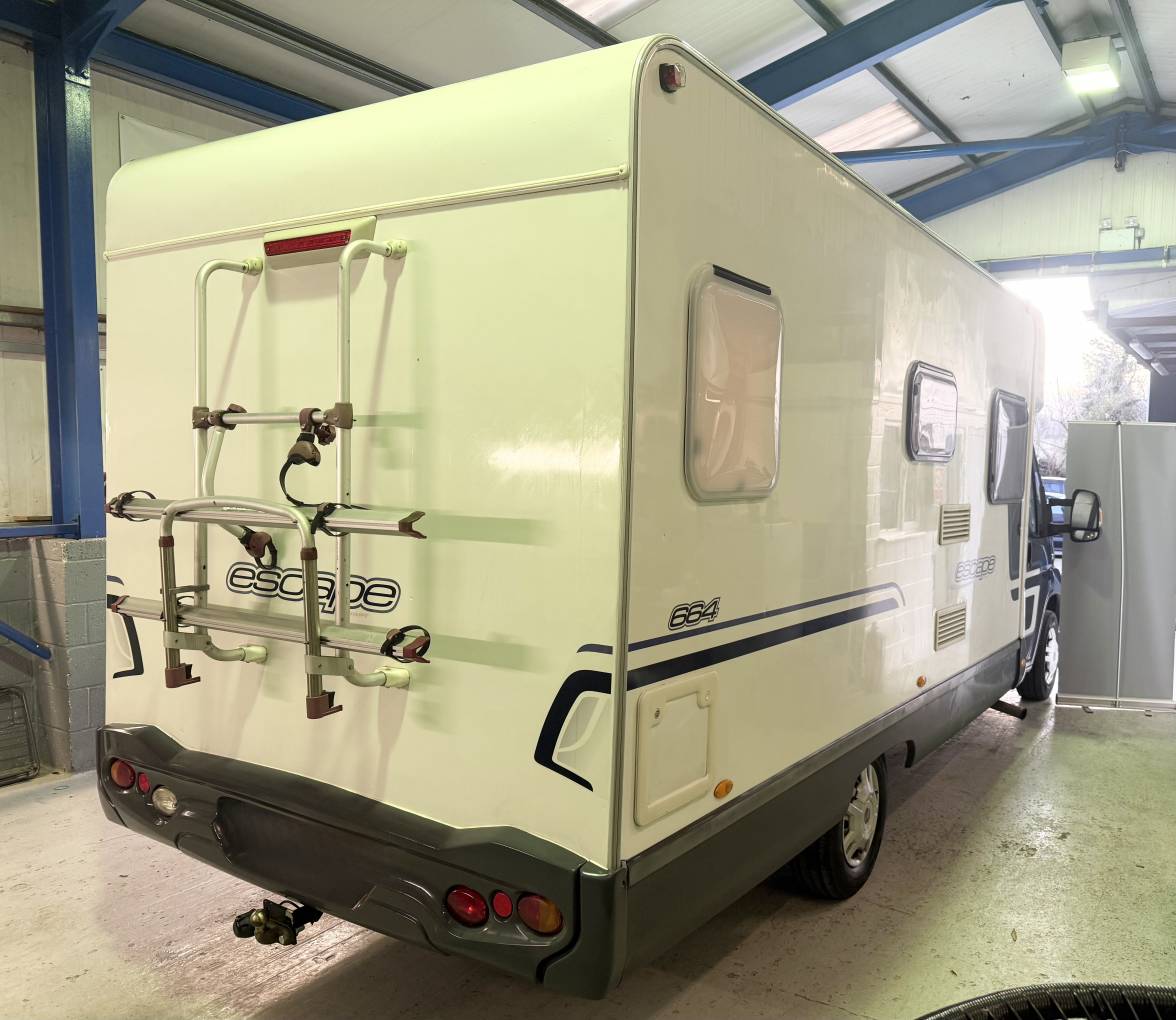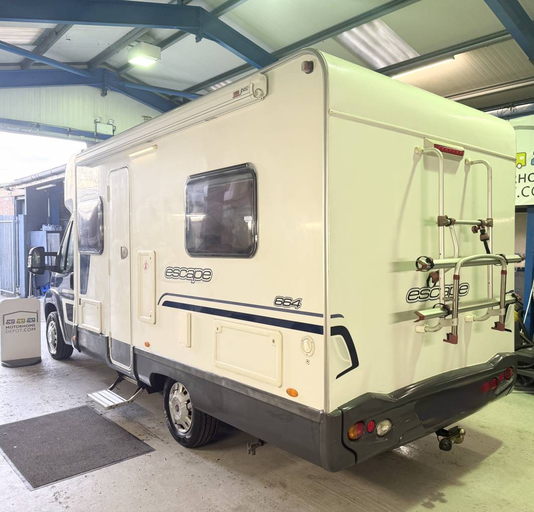 The 2011 Swift Escape 664 is a popular 4-berth, 4-belt motorhome built on a Fiat Ducato chassis, known for its rear fixed French bed, end washroom, and a versatile front lounge that converts into another double bed, featuring a well-equipped kitchenSleeping and seating up to four, it includes two rear travel seats in the dinette and a fixed French double bed with ample storage. The washroom features a WC, washbasin, storage, and a large shower with a curtain. The kitchen is equipped with a hob, 3-way fridge, oven, and sink, with a wardrobe opposite. The front half dinette seats six using swivel cab seats and converts into a second double bed.