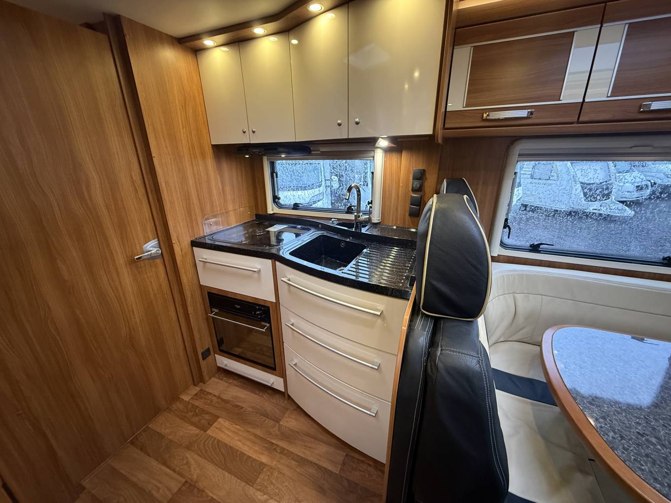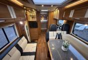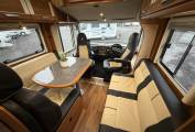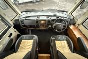 The layout of this luxurious motorhome is at the rear of the vehicle is a large fixed bed and loads of storage space thanks to the generous sized overhead lockers. Moving forwards you have a large enclosed toilet en-suite area with separate shower with screen and opposite this is a good size bathroom with toilet, sink, tap, storage cupboard and some shelving. The beautiful kitchen area is ultra stylish and features 3 gas burners, sink and tap and plenty of drawer space to hold ingredients and utensils. Moving in to the dining area the upholstery is finished in a lovely colour combination of cream and dark tan. There is a very large dining table and as both the front cab seats swivel you have a superb dining area for entertaining. Above the cab is an enormous pull down bed which easily sleeps 2 people in real comfort.
