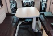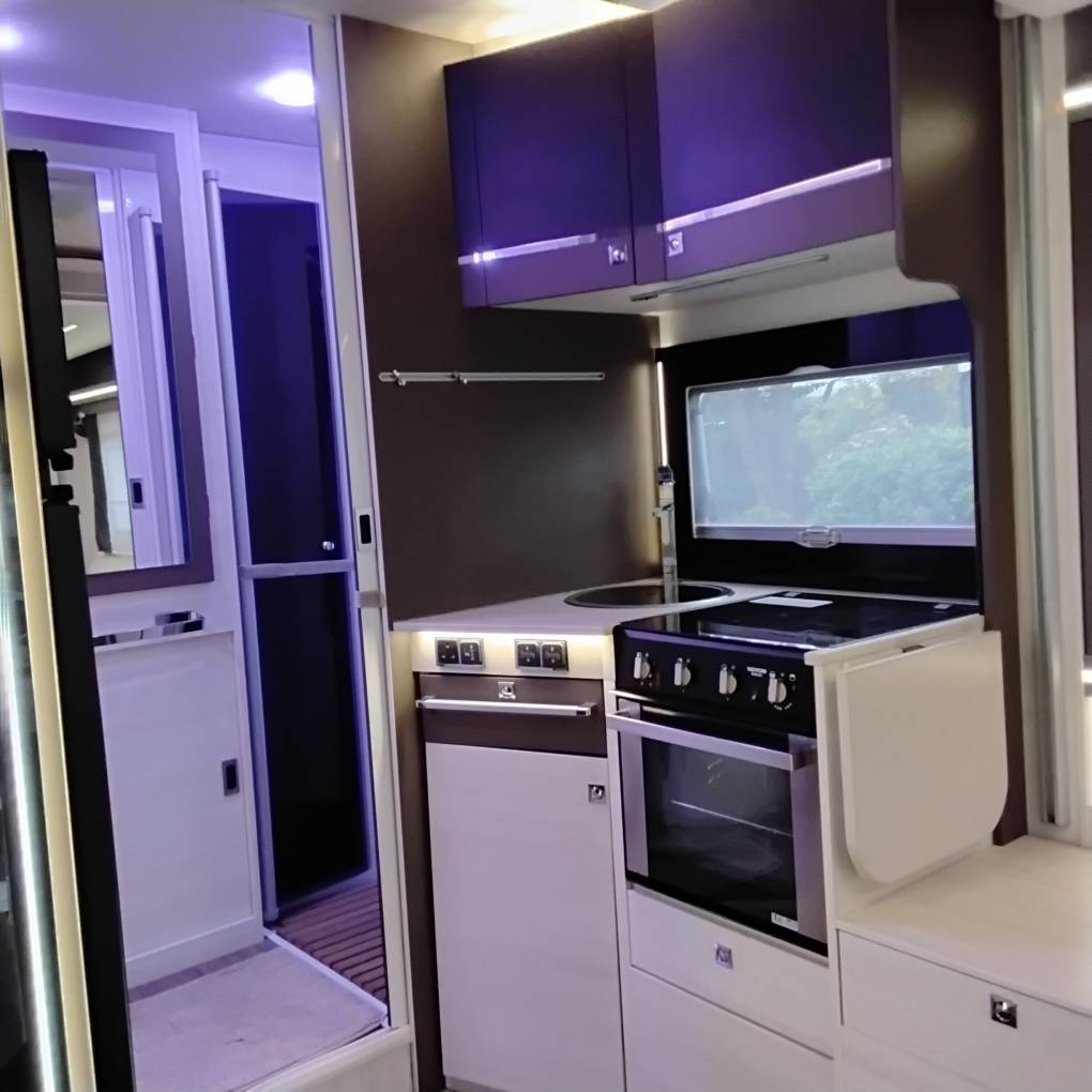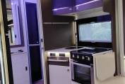 Spacious kitchen area comprises of good sized worktop complimented by fold up work top extension, deep useable sink, 2 huge overhead cupboards and large undercounter cupboard, cutlery draw, and Thetford N3000 large fridge/freezer, Thetford Triplex integrated cooker with 3 ring hob (2 gas and 1 electric), along with unused oven & grill with handy storage drawer beneath. Opening skylight above kitchen area to aid with light and ventilation.