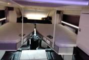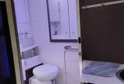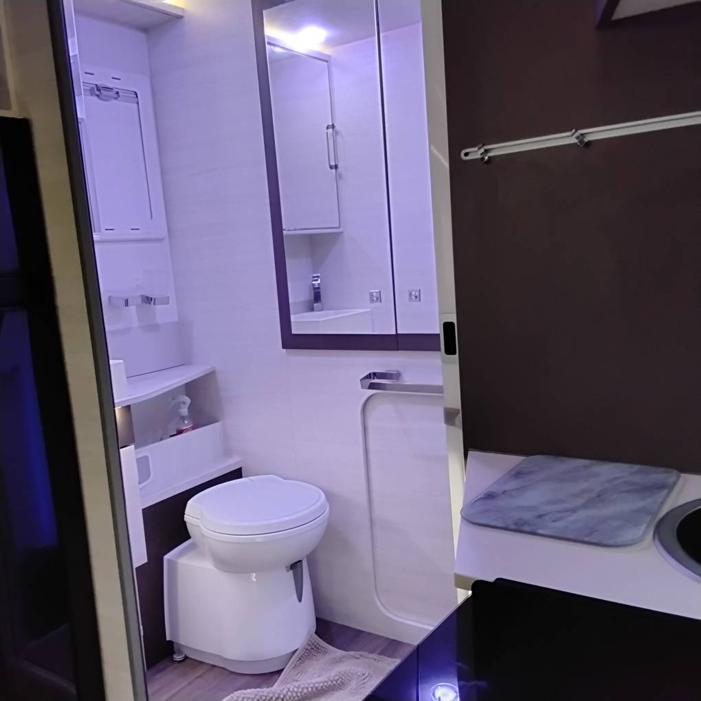 Spacious shower room / toilet, across rear of Motorhome including.. large basin above a generous drawer, good sized bathroom cabinet with sliding mirror door and lighting, next to immaculately clean Thetford toilet, opposite is the separate shower cubicle with shower door and non slip wooden insert. To the rear (and over the garage area) is a HUGE illuminated cupboard with 3 shelves.