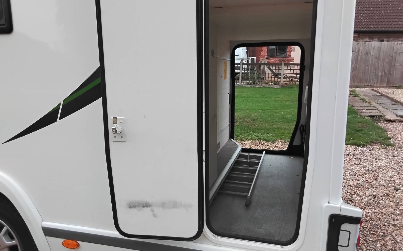 Huge heated garage, accessible from both sides, with upper shelved level from near side. (Off side door = 690mm wide x 1150 high & Near side door = 420mm wide x 1840mm high) Can easily accommodate 2 electric bikes, along with many other items, and also provides 12V and 3 pin sockets.