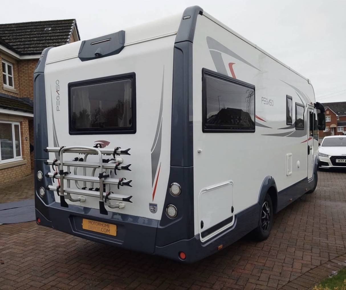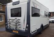 The motorhome comes with 4 travelling seat belts, driver and passenger airbags, electric window and mirrors, multimedia system including radio, CD, DVD, Bluetooth and reversing camera, cab air con, cruise control, integrated concertina front cab blinds, tracker, solar panel, WIFI Box, Truma heating and hot water system, TV and aerial, satellite, bike rack for 4 bikes and a fixed wind out awning.