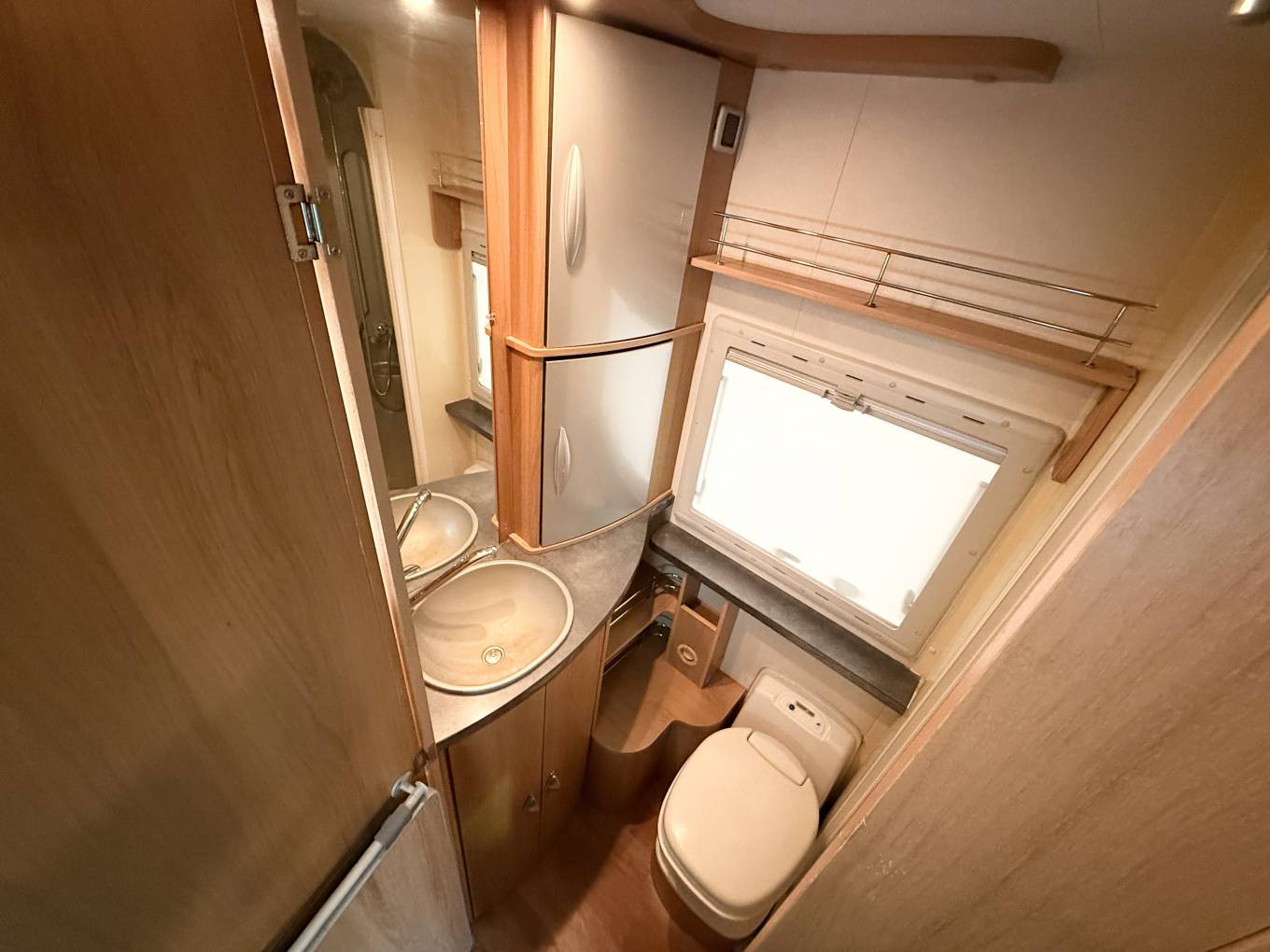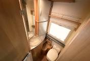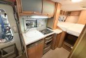 Moving rear is the galley kitchen with round bowl stainless steel sink, oven and grill with 4 burner gas hob. Under the counter is a Dometic fridge/freezer. Opposite is the Washroom with Separate shower unit with Perspex doors to close. A Thetford swivel top cassette toilet, a grey oval wash hand basin with chrome mixer tap.