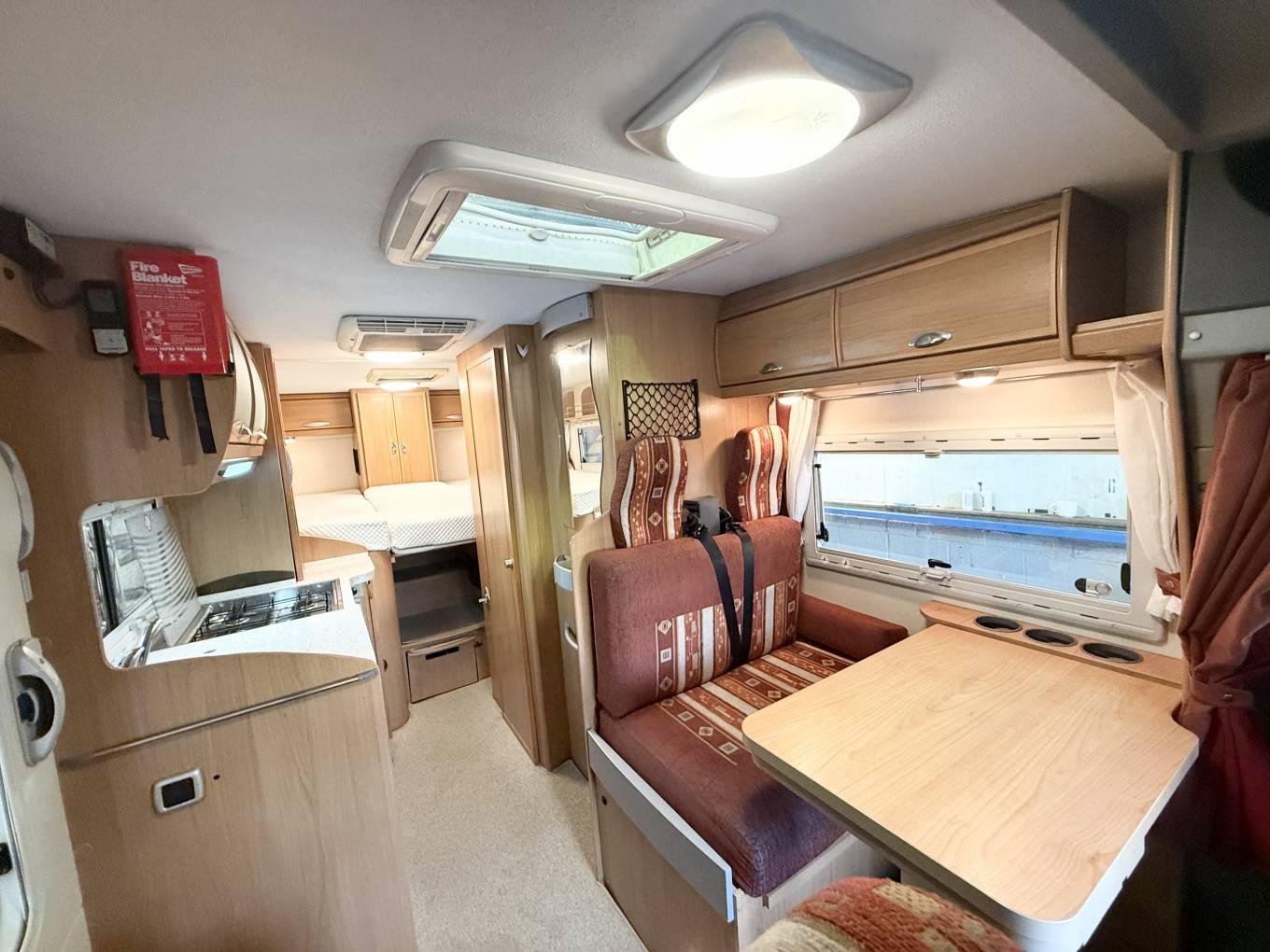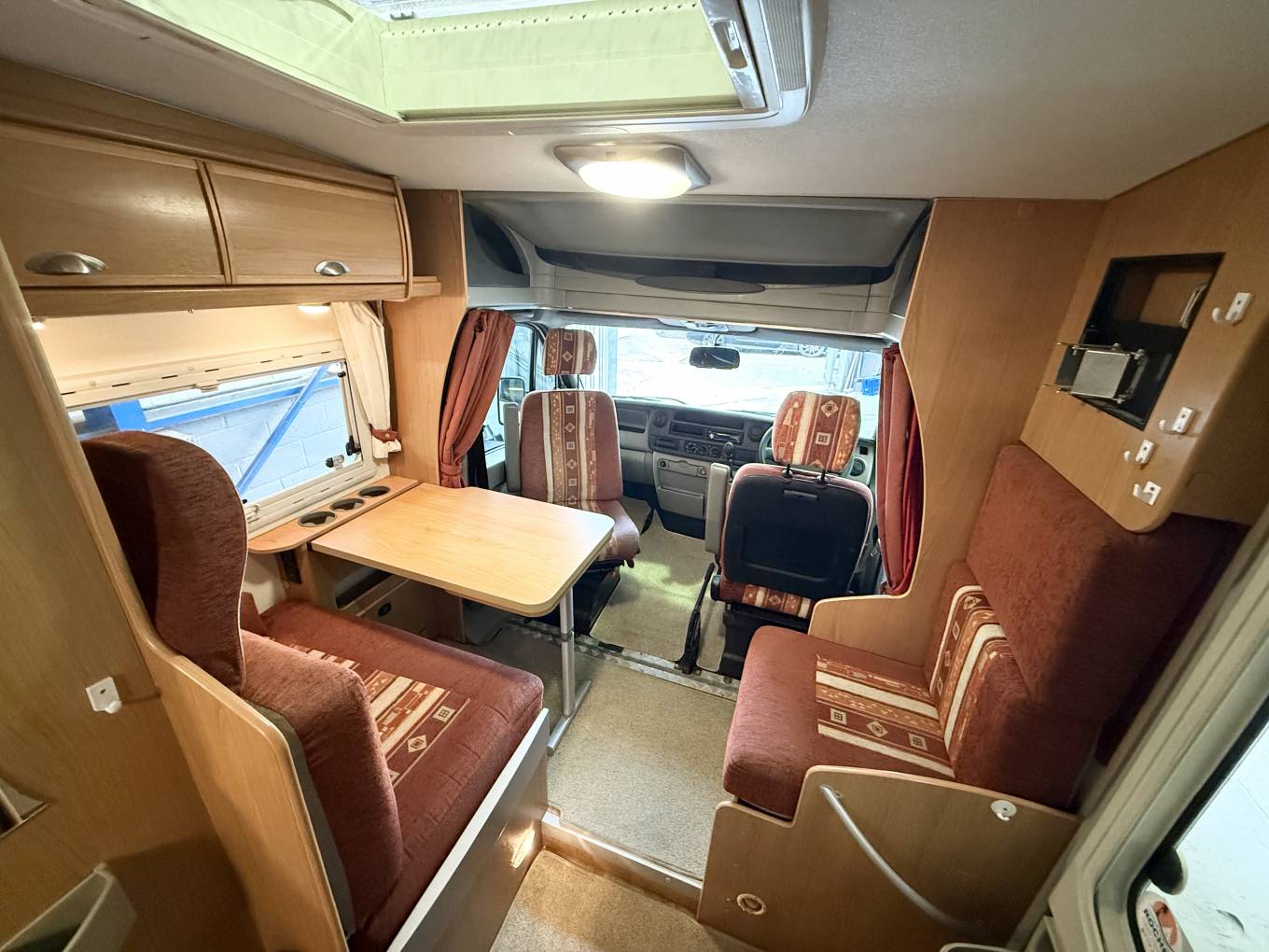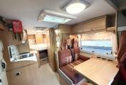 We enter on the Drivers side immediately to the right is the half dinette comprising a fixed table and two forward facing seats with 2 x 3 point seat belts for travelling passengers and a single seat by the door. The front seat can rotate to join this area so you could easily seat 5 round the table while entertaining on site.