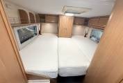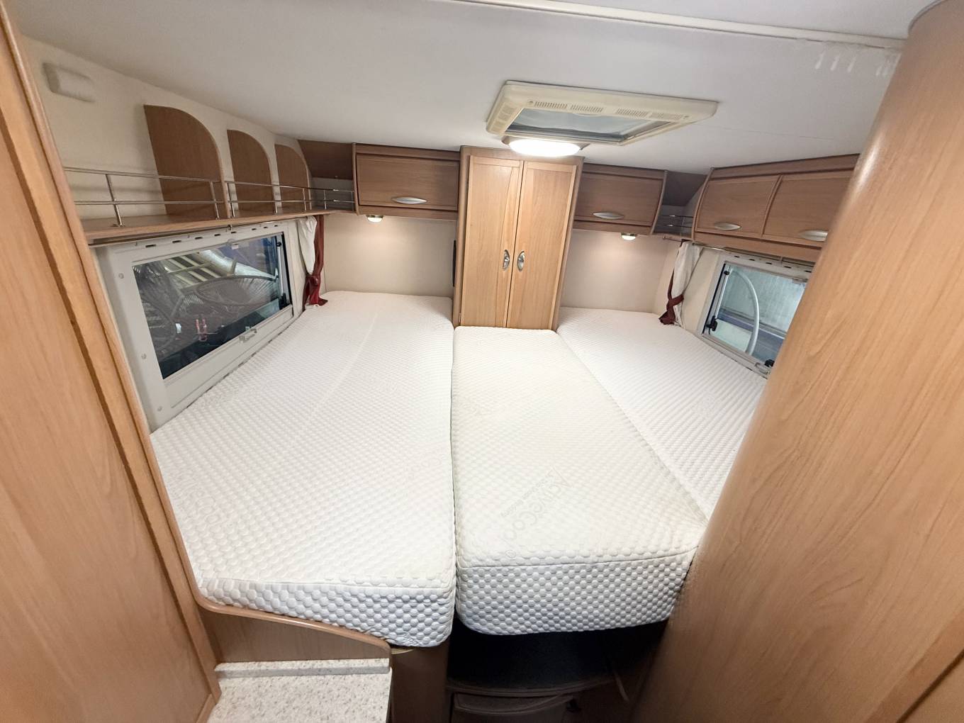 To the rear are the fixed Twin single beds over garage, middle section pull out with infill to enable a large double bed. Access by wooden steps with storage below. Door to garage, Under bed storage cupboards.