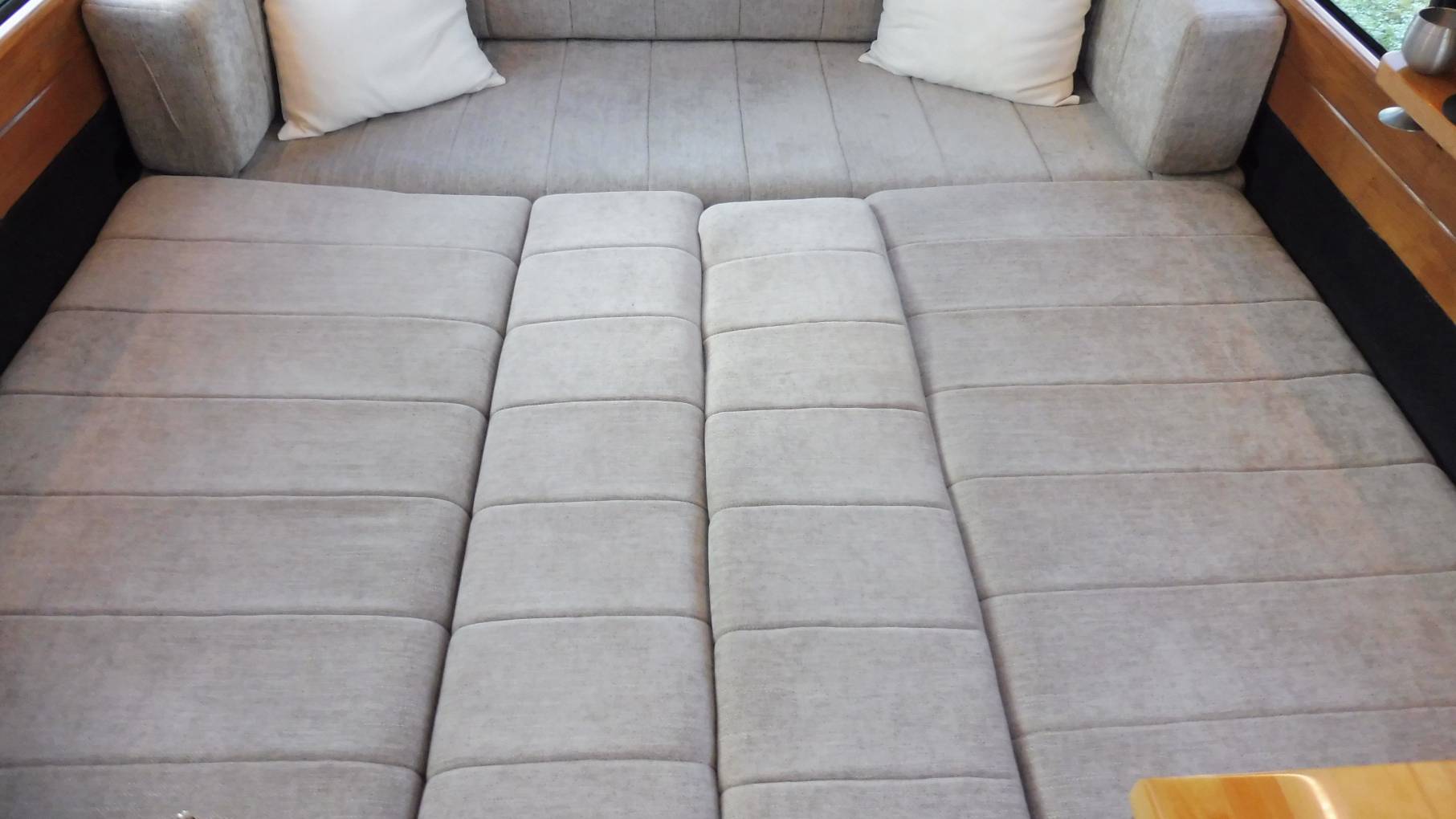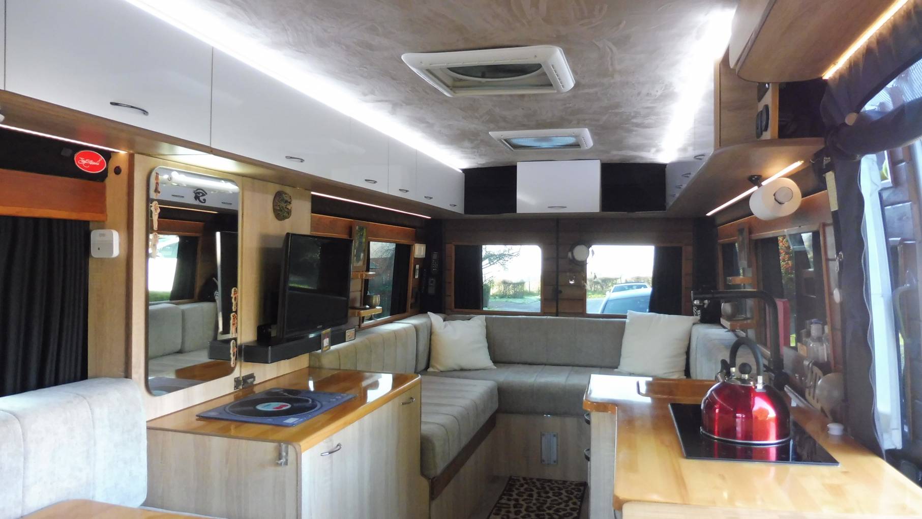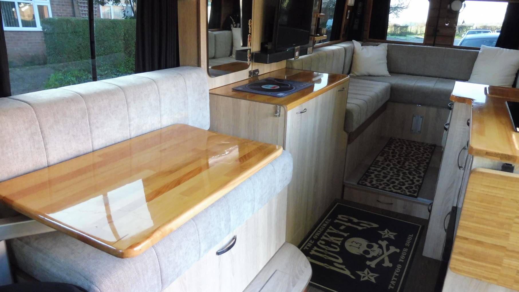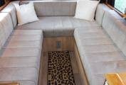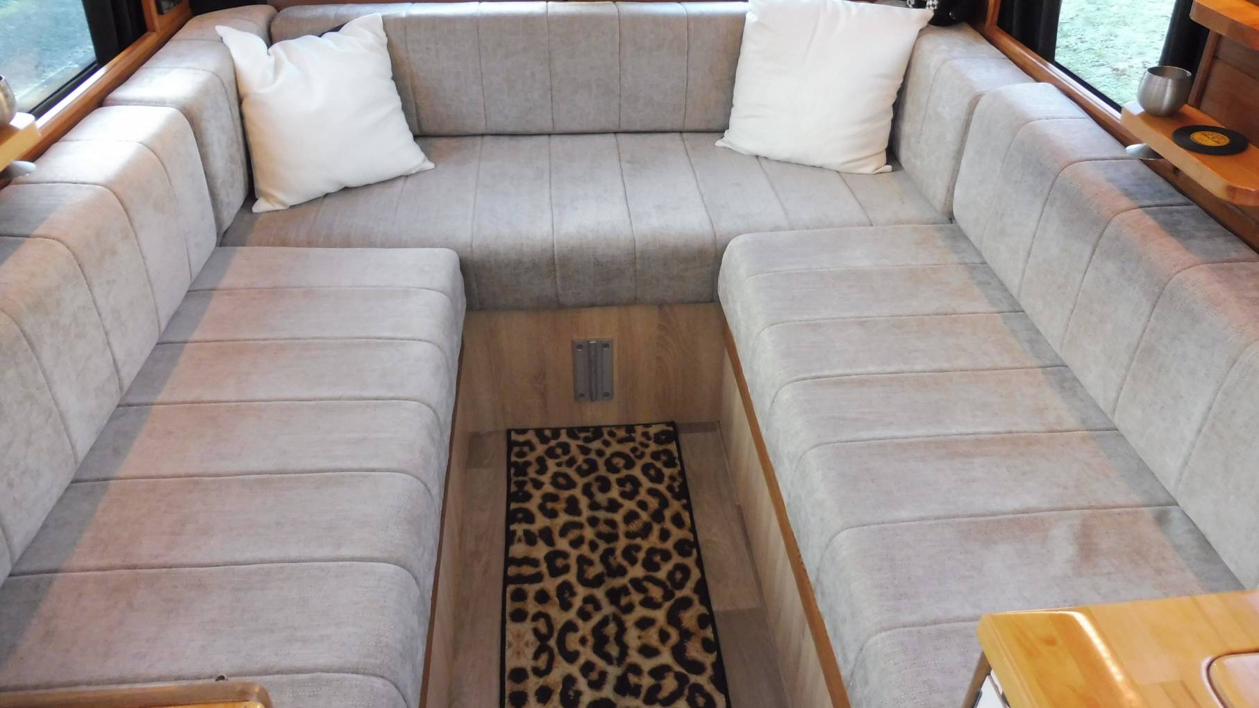 The U-shaped rear lounge is perhaps for cooler days or perhaps just a comfortable place to stretch out and watch the Smart TV, with soundbar, using the fitted 4g wifi router. Adjustable mood lighting and DoDo soundproofing allows you to party without disturbing the neighbours, too much! At night the seating converts into a large double bed or can be used as two singles.
