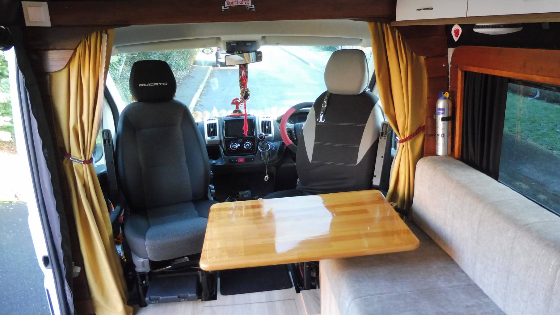 Entering through the sliding door you step into the front seating area. A side sofa along with swivel Captain’s seats is the perfect space to relax for a meal around the moveable oak table; with the door open a real ‘room with a view’.