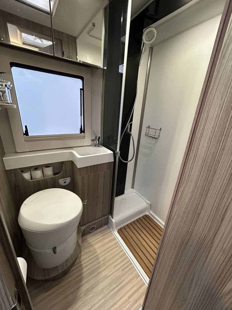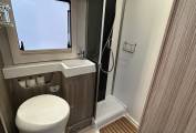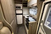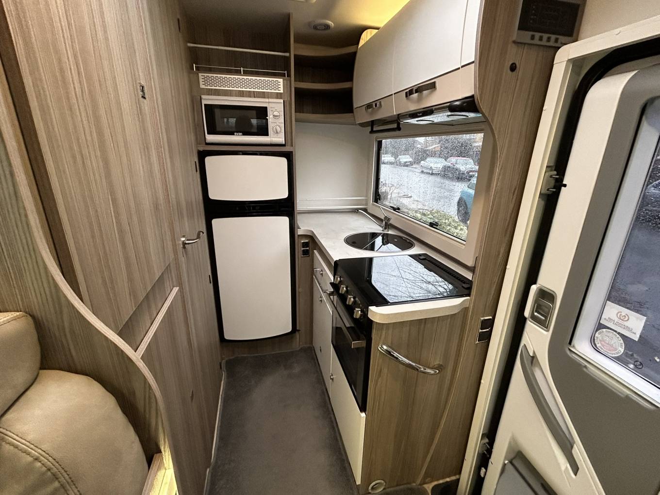 The kitchen is well equipped with a 3‑way fridge freezer with automatic selection, allowing flexibility whether on site or off grid, while the Truma heating and boiler system ensures reliable hot water and heating in all seasons. A solar panel and built‑in Wi‑Fi system further enhance independence and comfort when touring away from mains hook‑up.