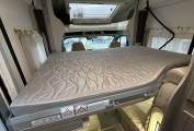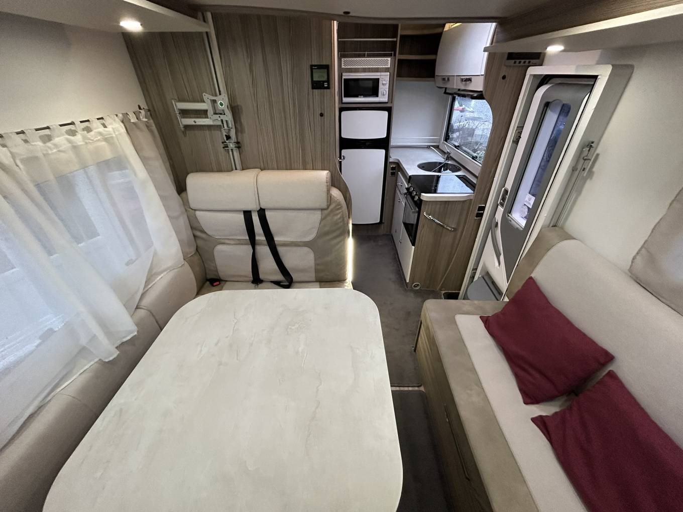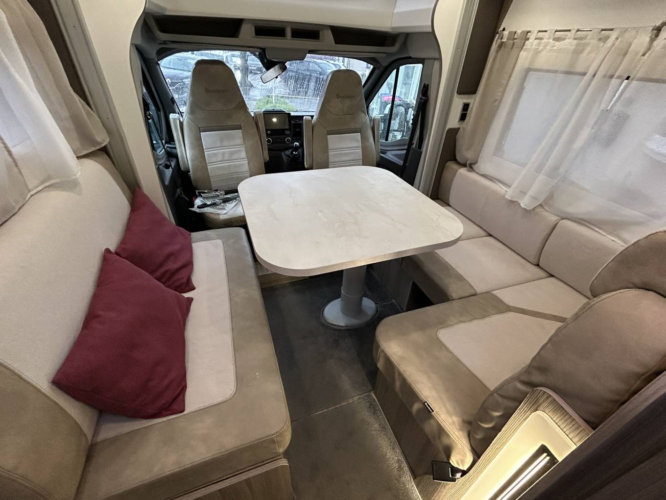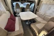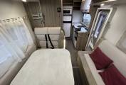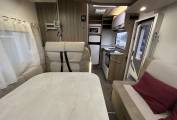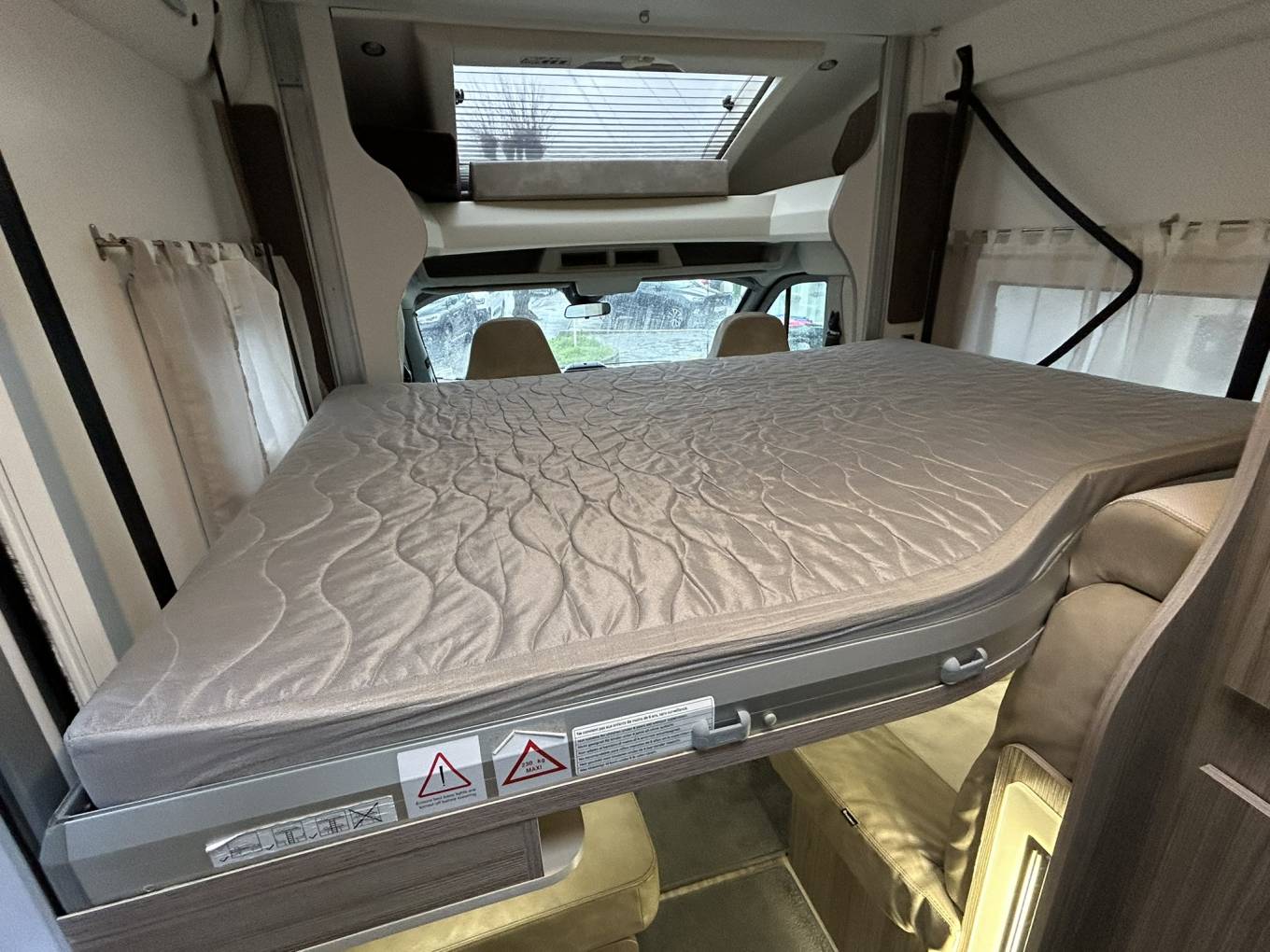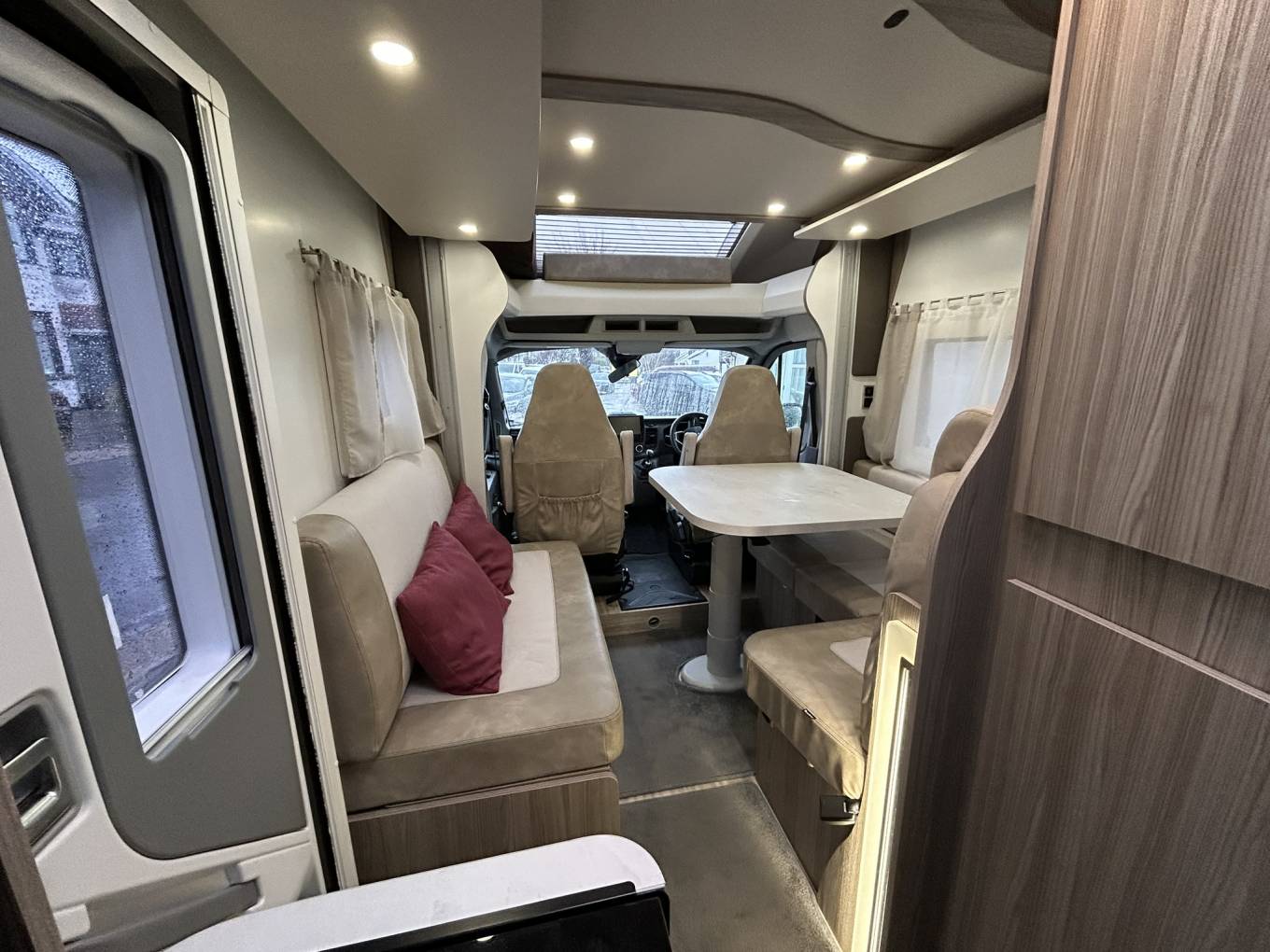 Inside, the layout is bright and spacious, centred around a comfortable lounge that benefits from full cab privacy blinds and a clever electric drop‑down bed, allowing the living space to remain open during the day without the need for constant bed conversion. To the middle/rear, the generous garage provides storage space for outdoor gear or touring equipment, making this model particularly practical for longer trips.