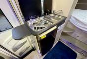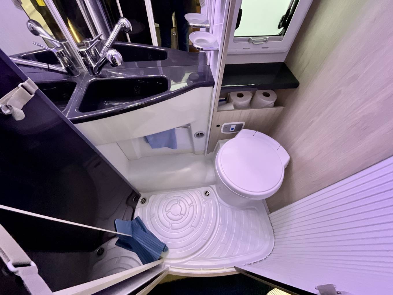 Opposite, you have a generously sized washroom, with Thetford toilet with cassette, shower and washbasin, vanity unit and privacy door.
