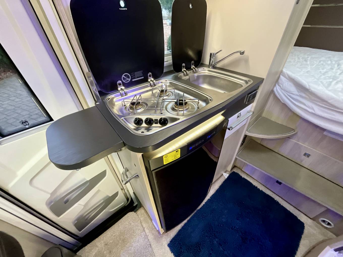 The galley comes equipped with three gas hobs, three way fridge/freezer, sink, fold out preparation space, Russell Hobbs microwave and plenty of storage.