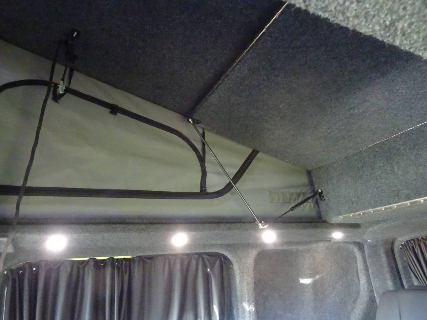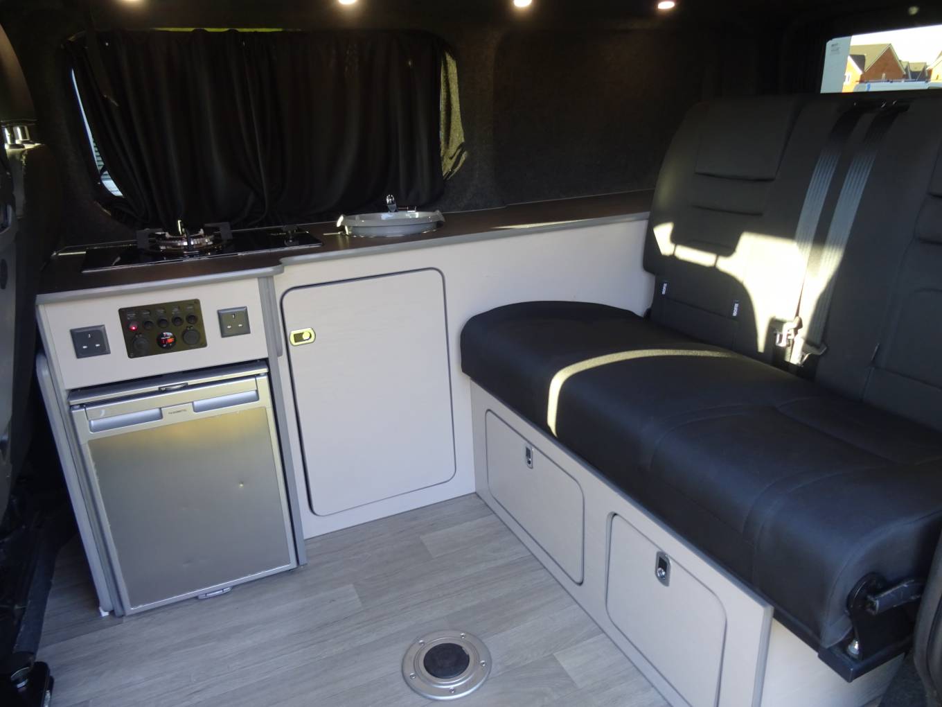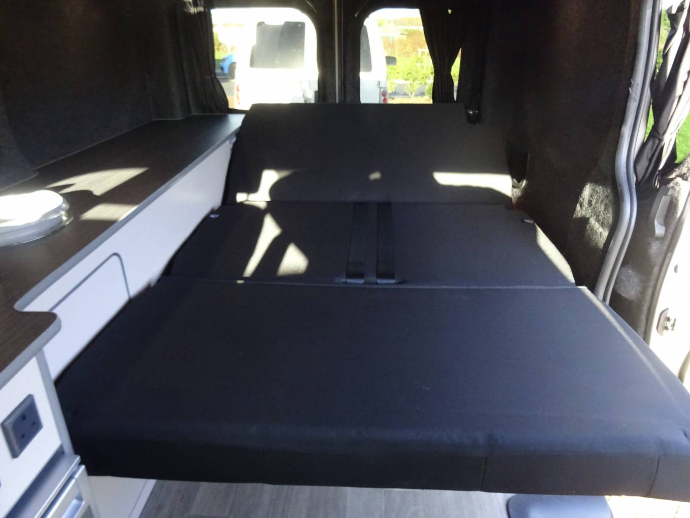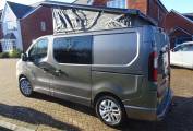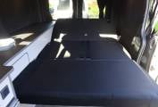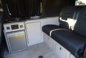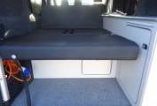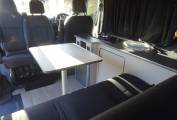 The twin passenger seats swivel on the railed Swivel King system and lift up for storage and there is a pole table. The rear bed is a high quality Top Tether Rib Bed with the all important recline settings. We have the Van Lidz elevating bi-fold roof system with deluxe canvas upgrade. This can be fully unzipped to a scenic opening. There is rear under seat storage, and side cupboard storage, a long worktop, single gas hob, 12v fridge and lighting. The build also incorporates solar, sound proofing and insulation.