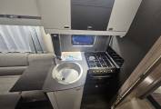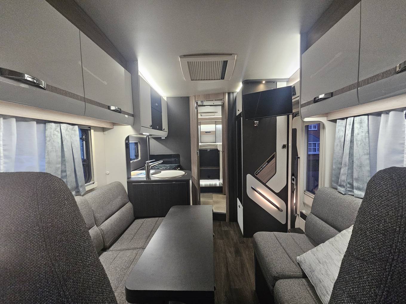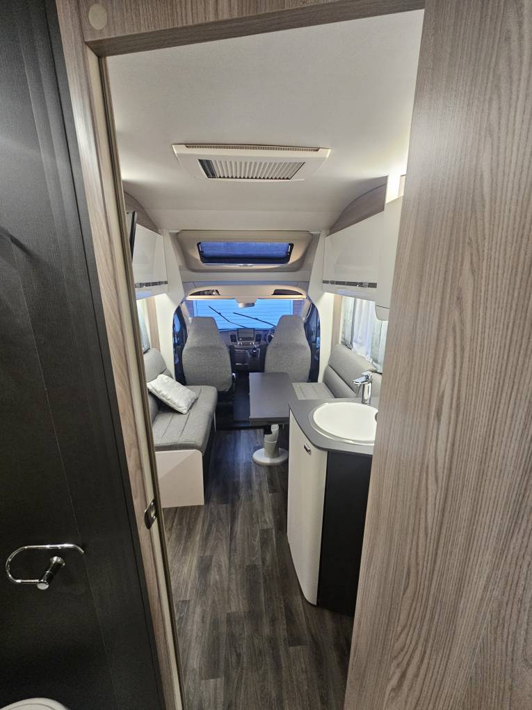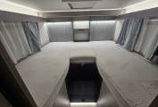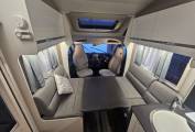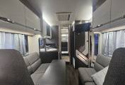 This layout offers, with twin fixed single beds to the rear fitted with premium Duvalay Duvalite Alto mattresses, and a front lounge that converts into a comfortable double. The front back two extra Aguti travel seats include ISOFIX. The lounge area benefits from upgraded soft furnishings, a large skylight, and a drop in dining table. Twin TVs are fitted one in the bedroom and one up front.