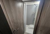 The central kitchen features a Thetford Triplex combination oven and grill, 3 burner hob with electric hotplate, and a High standing Dometic fridge, while the washroom offers a separate Ecocamel Jetstorm shower, cassette toilet and full height vanity mirror. Heating and hot water are supplied by a Truma CombiNeo dual fuel system, and a workshop fitted Truma Aventa hab air con unit is installed overhead.