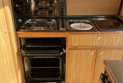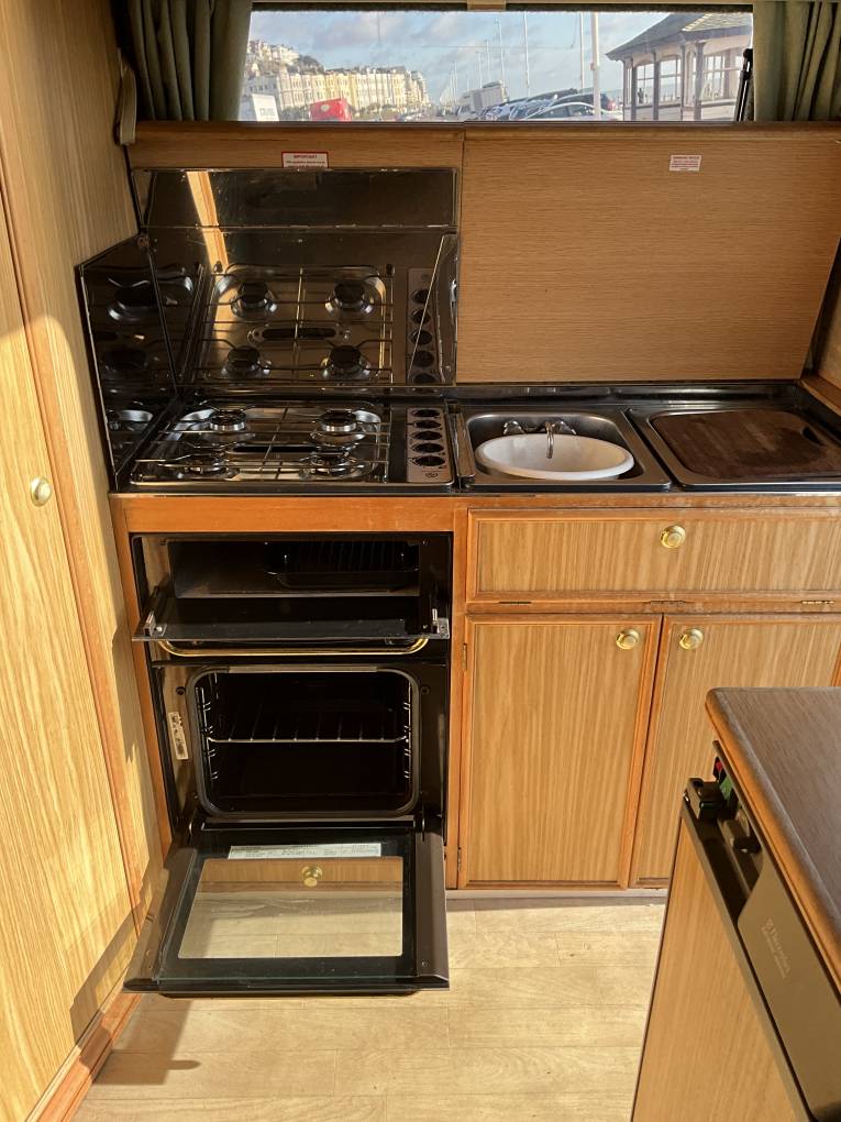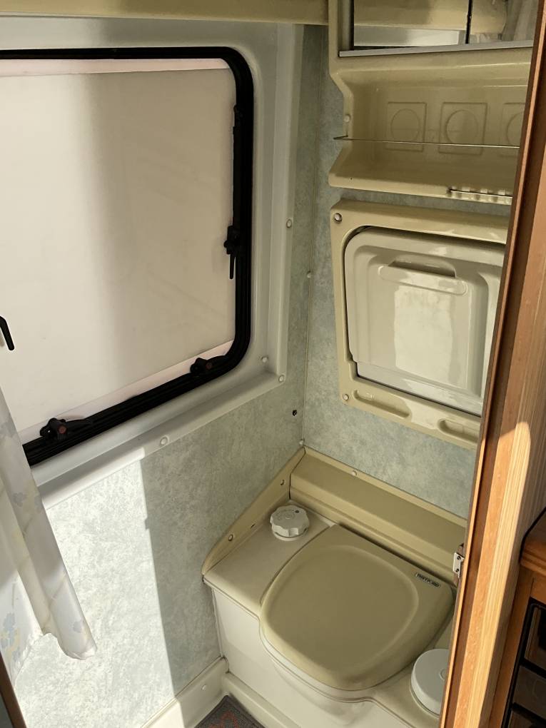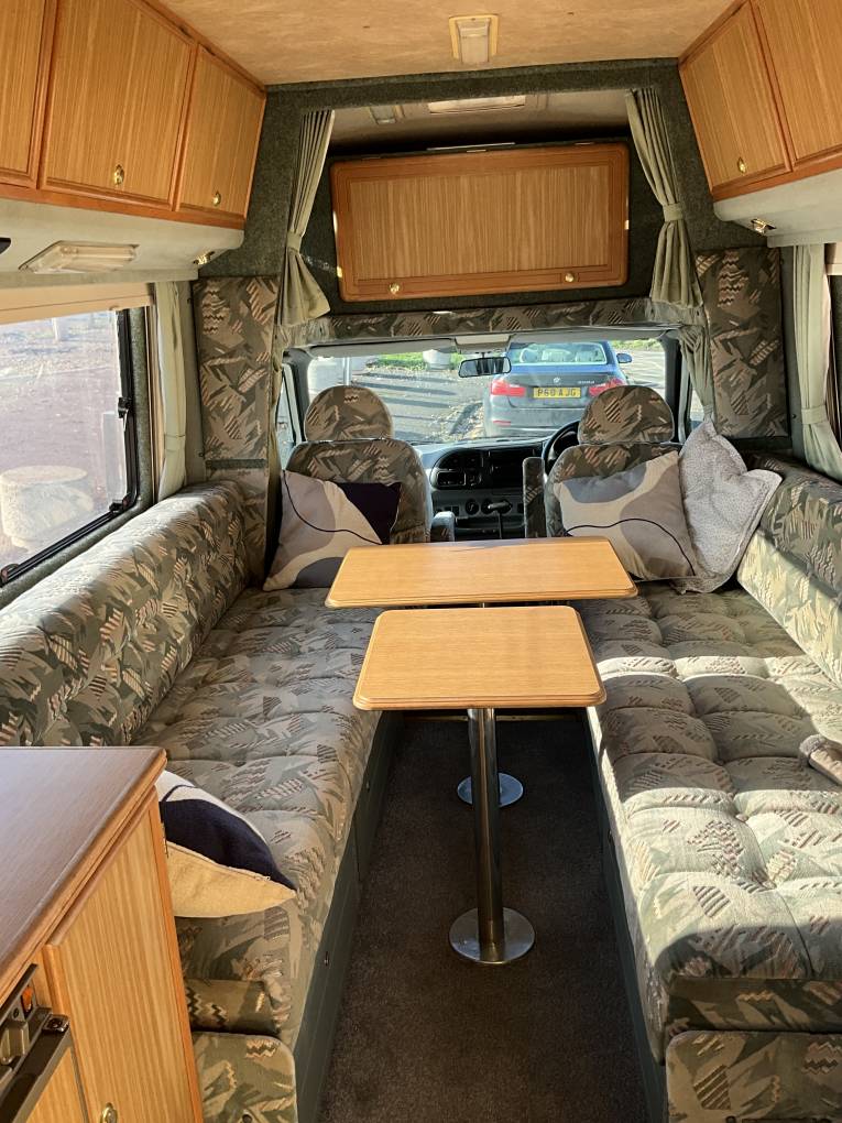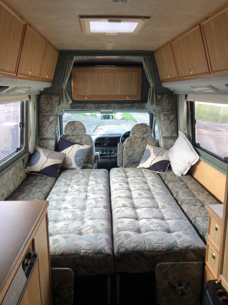 At the rear is a well presented kitchen and next to this is the bathroom with shower, toilet and wash basin. In the centre is the lounge area with 2 large bench seats that can be made into 2 single beds or one large double and at the front there is an extra space for sleeping with an over cab bed. It comes with Blown Air Heating, Gas Refil system, TV aerial (no TV included), Electric Step, and 2 sets of keys.